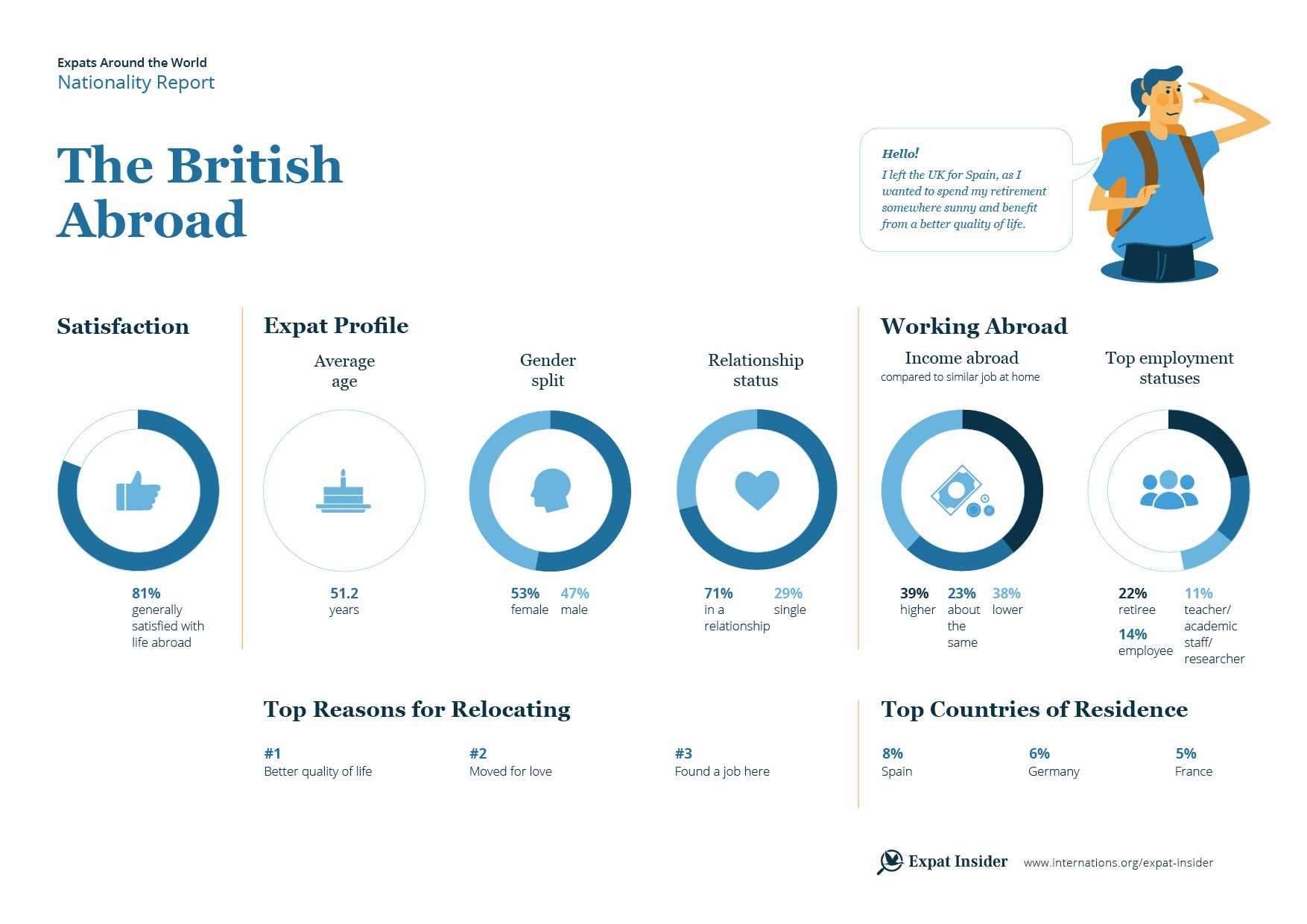 A quarter of Brits abroad have dependent children living with them, while another three in ten have children that are already living on their own. The latter is almost double the global average (16%) and may be connected to the fact that a large proportion of British expats are retirees. All things considered, more than four-fifths of Brits abroad (81%) are generally happy with their life.