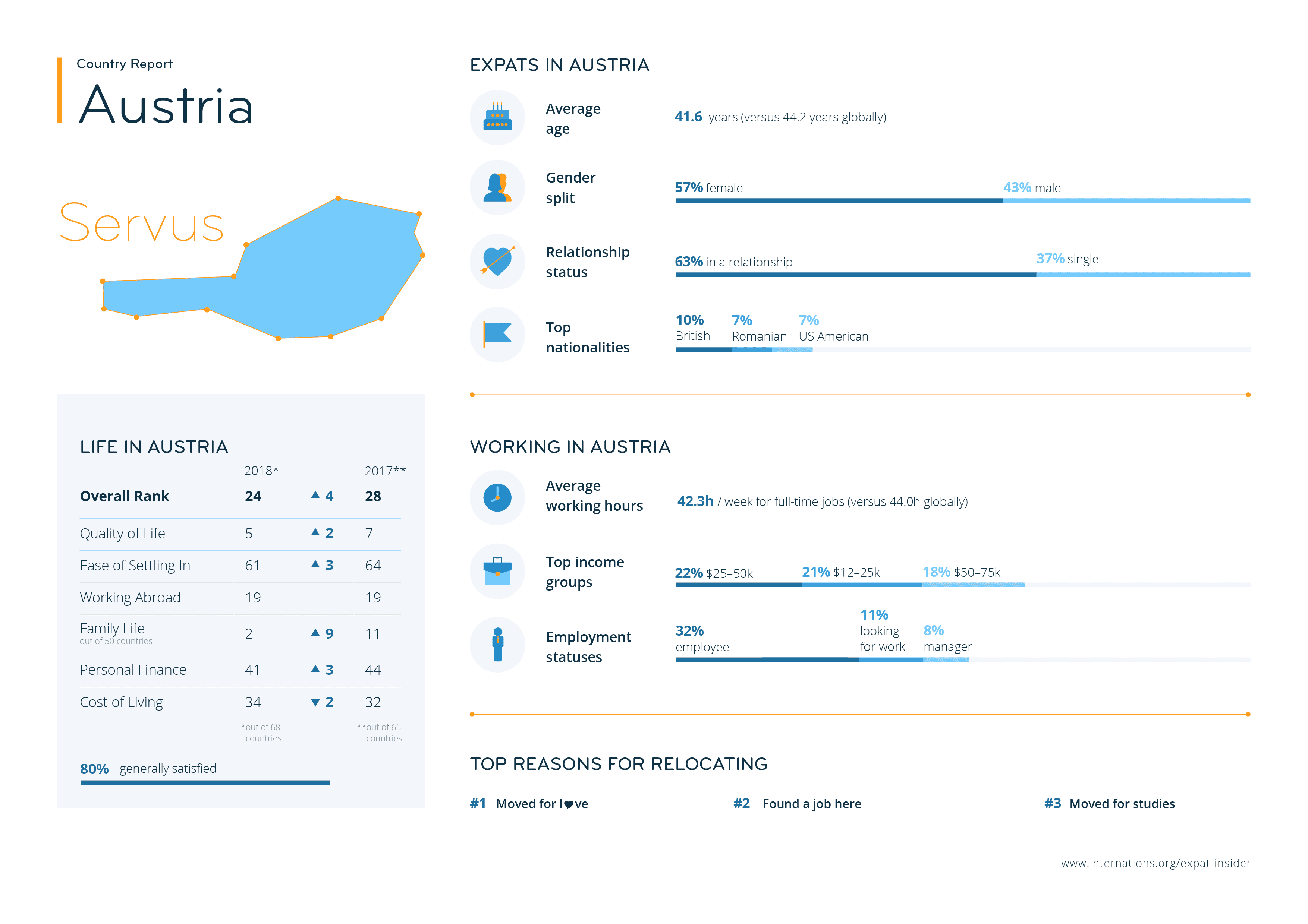 The cost of living ranking is quite average for Austria, with a score of 34th out of 68 countries. However, the comparatively low gross yearly household income among expats is interesting: a majority (54%) have an income of 50,000 USD or less, compared to the average of 48% on a global basis.