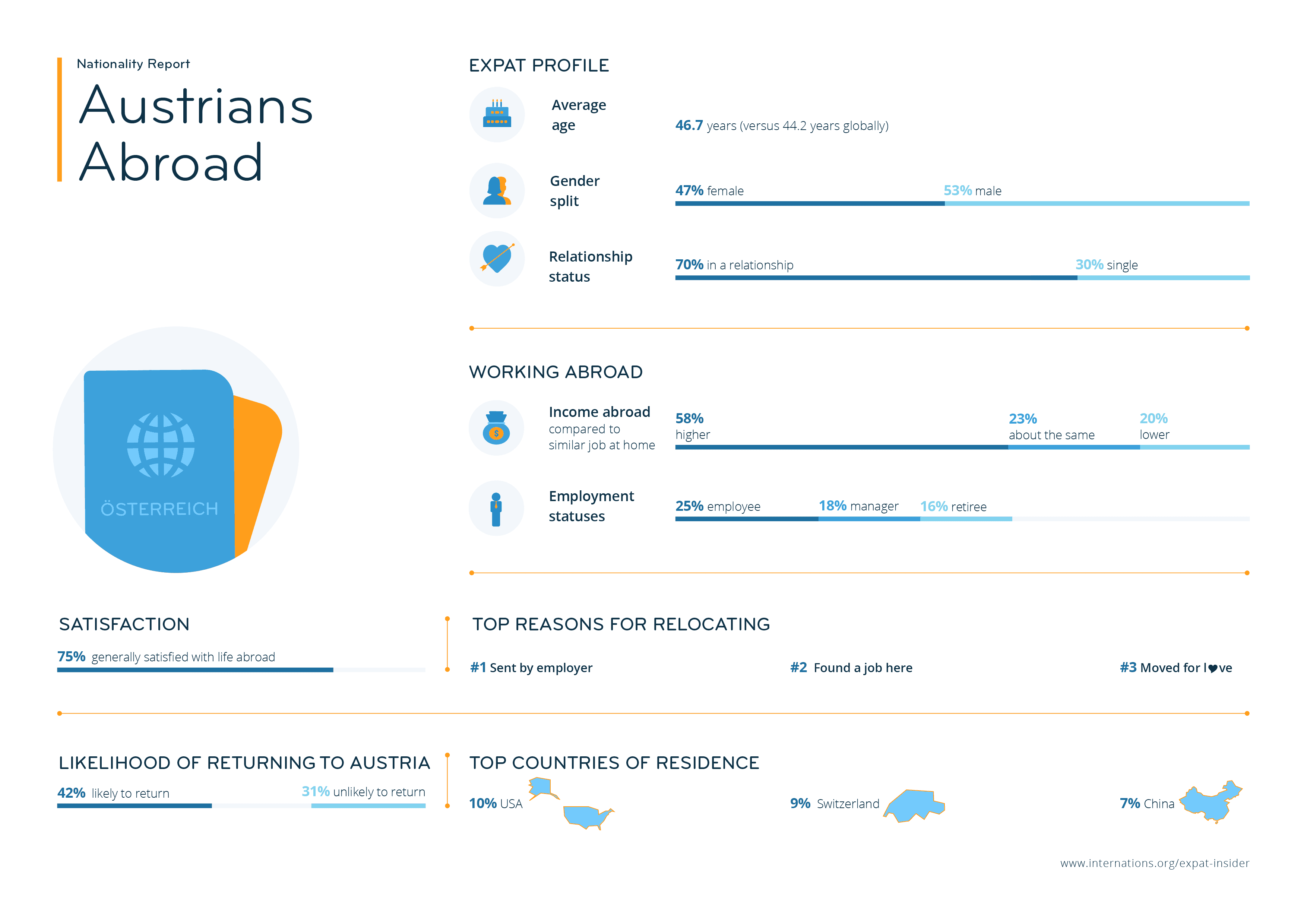 When it comes to their motivation for moving abroad, it seems that Austrians are very career oriented. Although 10% say they moved to live in their partner’s home country or for love, the top two reasons for moving abroad include being sent abroad by an employer (14%) or finding a job on their own (12%). A quarter of Austrian expats are working abroad as employees, while 18% describe their employment status as managers, slightly more than the survey average (14%). In total, 16% of expats from Austria are retirees, five percentage points above the global average.