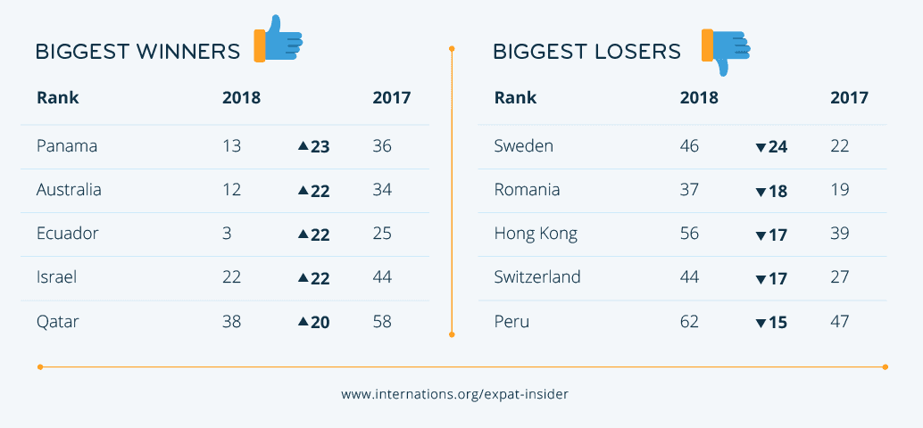 Its mediocre 36th place in 2017 seems to have been the exception rather than the rule: Panama has found its way back into the top 15, ranking 13th out of 68 countries in 2018. Panama’s recovery is already noticeable in the respondents’ general satisfaction with their life abroad: while in 2017 less than three-quarters of the respondents in Panama (74%) said they were generally satisfied, this percentage has increased to 81% in 2018.