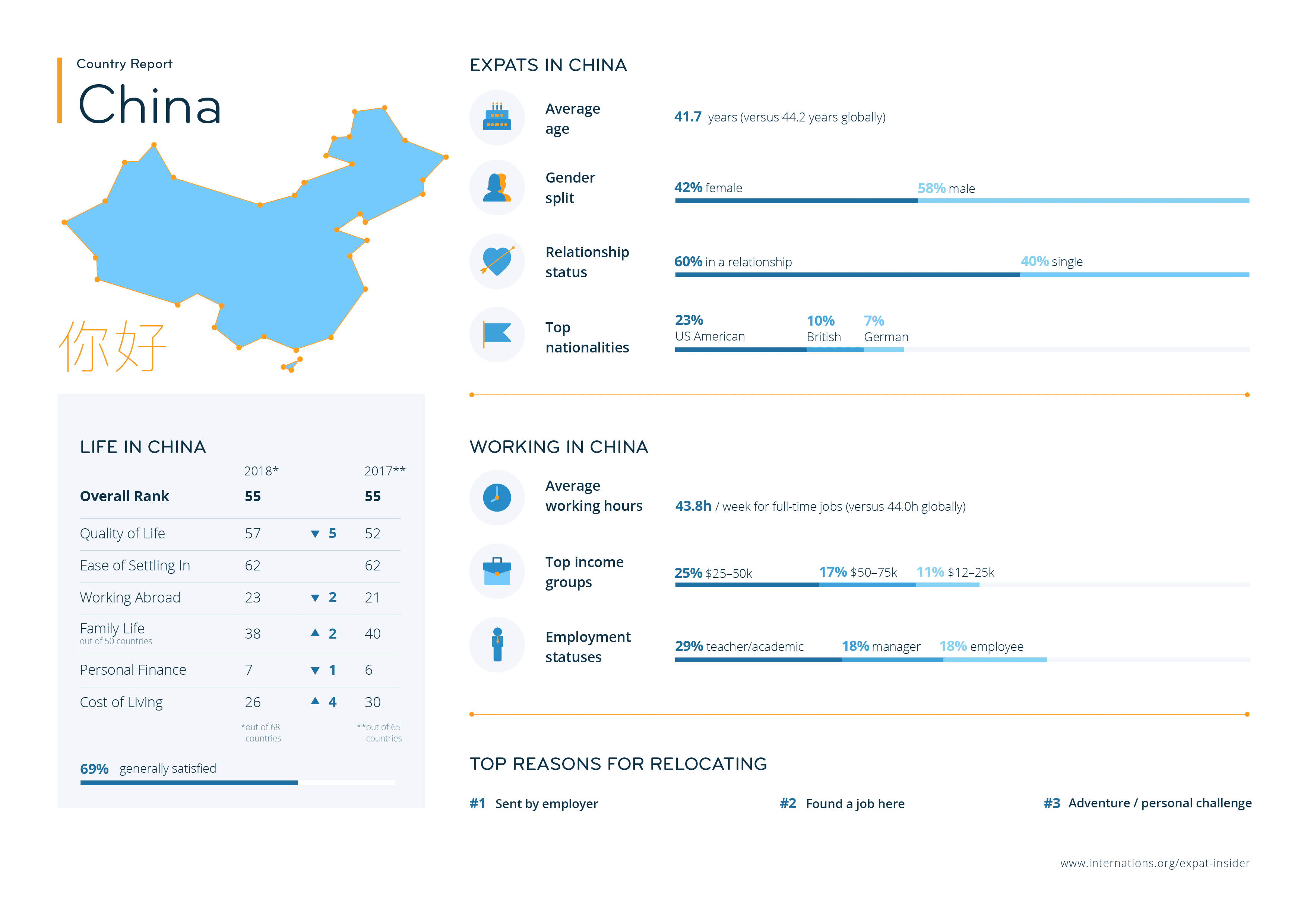 In 2018, China places 62nd out of 68 countries in the Ease of Settling In Index. On average, 59% of all respondents worldwide say that settling down in other countries is easy, but in China, only 36% of expats say the same. The difficulty that expats experience with settling in could be due to the problems they encounter with the language, among other things.