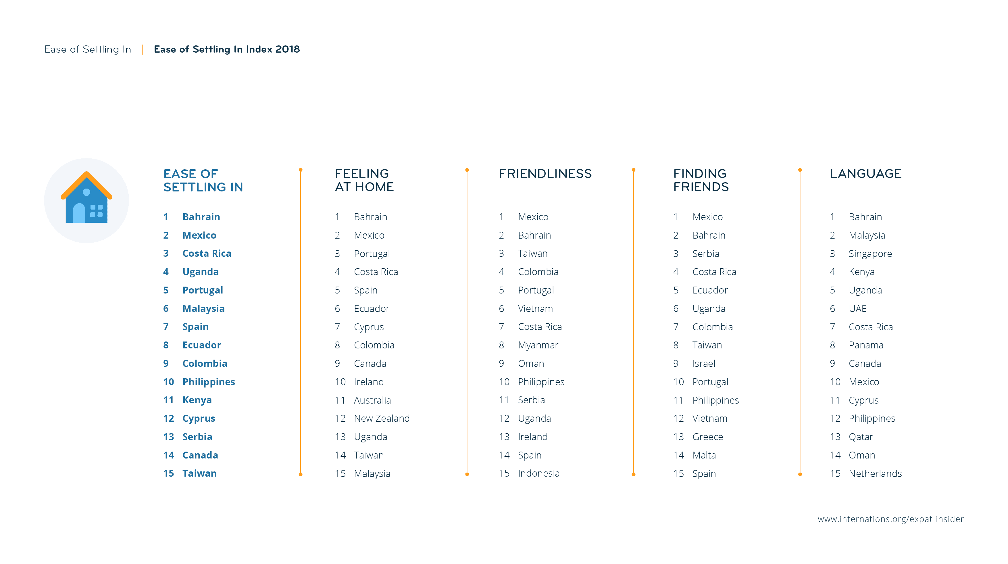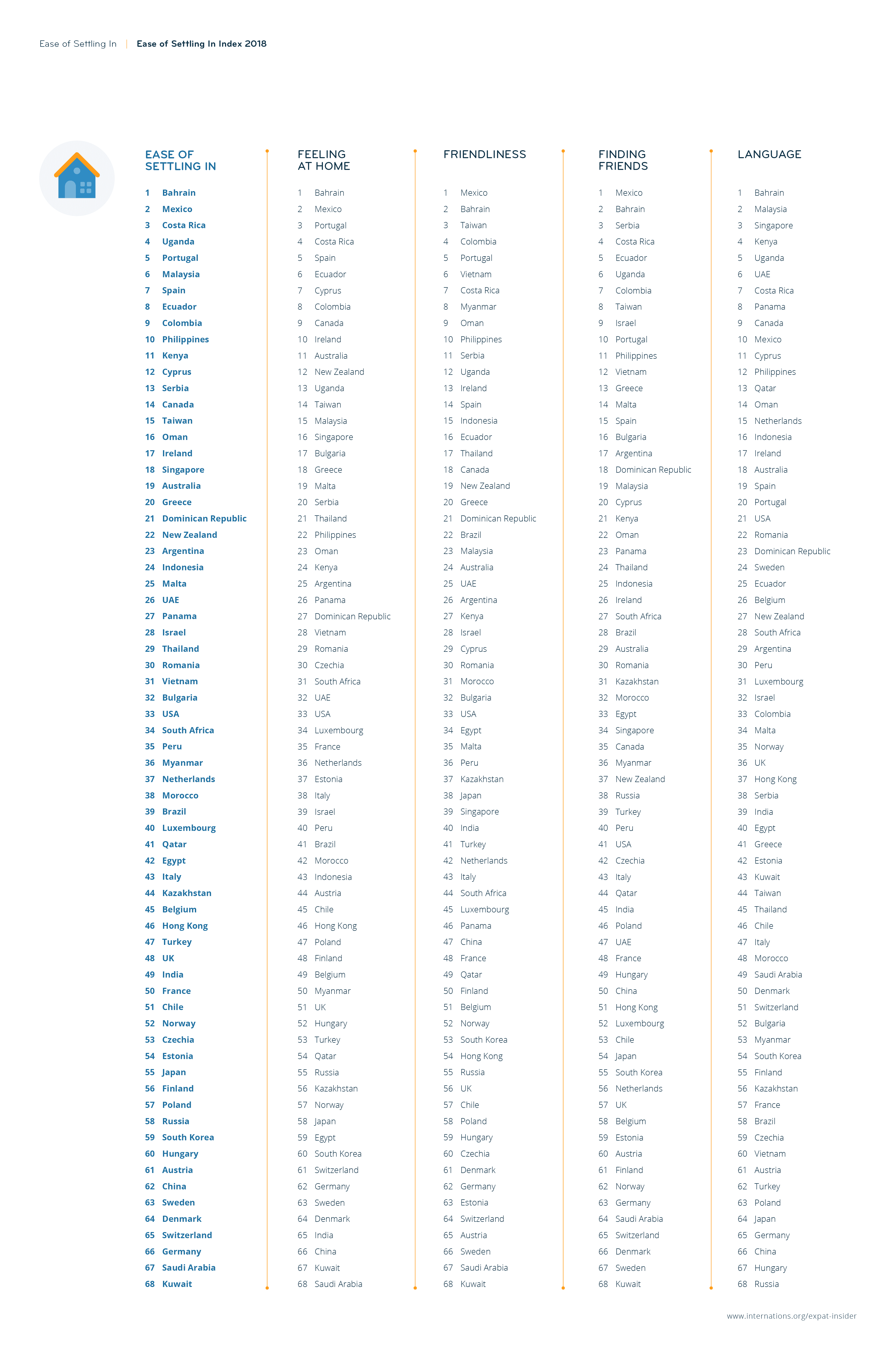 For the Ease of Settling In Index, respondents were asked to rate various “soft” factors related to this area on a scale of one (very poor) to seven (excellent). Factors included topics such as making friends, the friendliness of the local population, feeling at home in a country’s culture, and how easy and important it is to speak the local language. For a country to be featured in the report, at least 75 respondents were required: a total of 68 countries met the minimum sample size requirement.