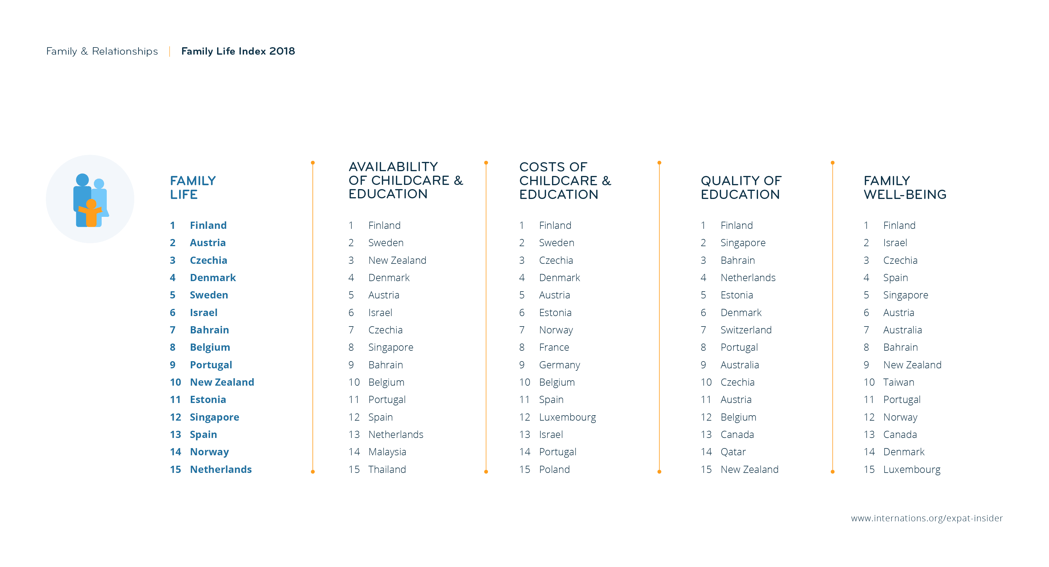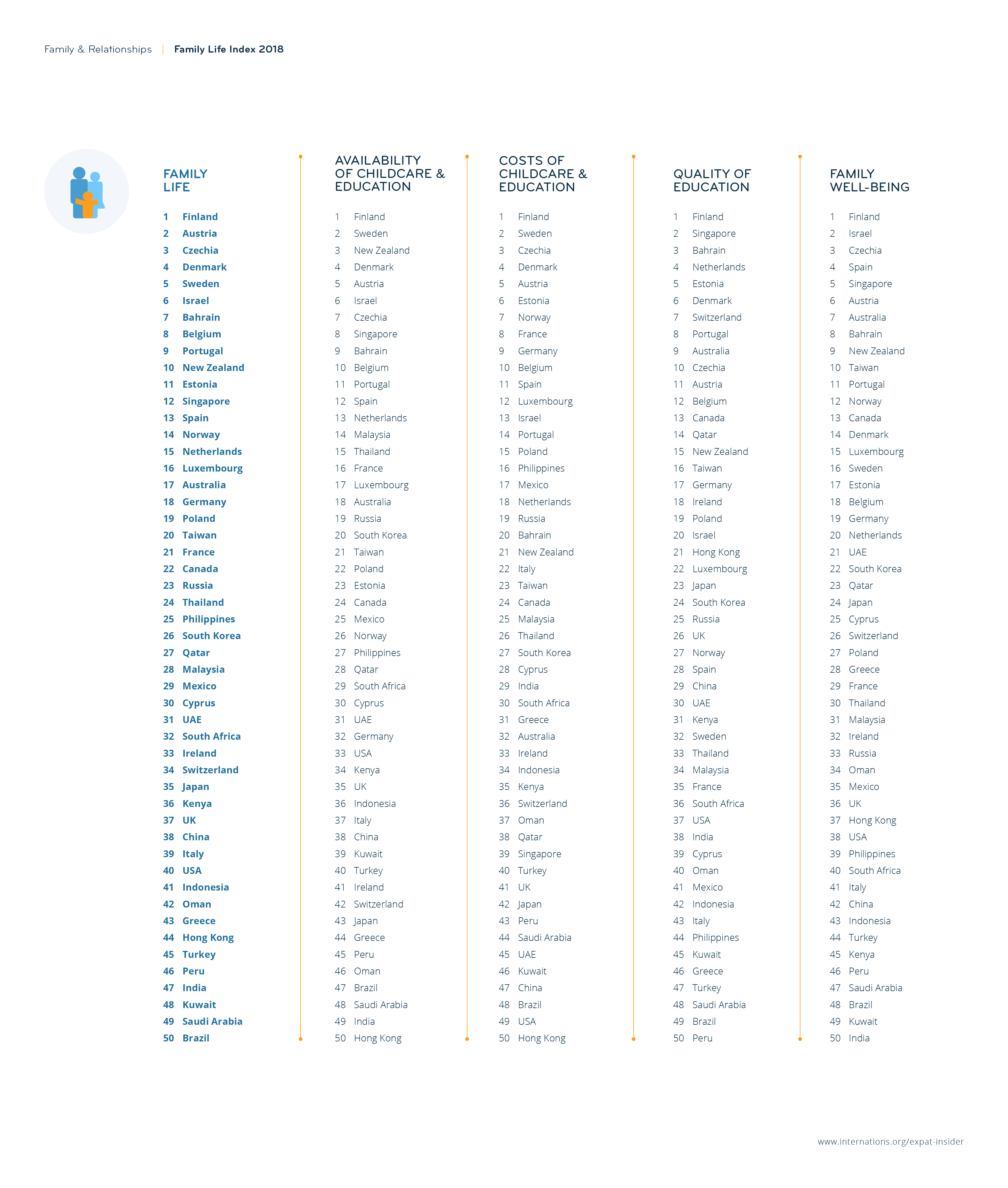 The Family Life Index includes 50 countries, each with a minimum sample size of 40 expats whose dependent children are living abroad with them. The index covers various factors grouped together into six different subcategories: Availability of Childcare & Education, Cost of Childcare & Education, Quality of Education, Family Well-Being, Childcare Options, and Options for Children’s Education.