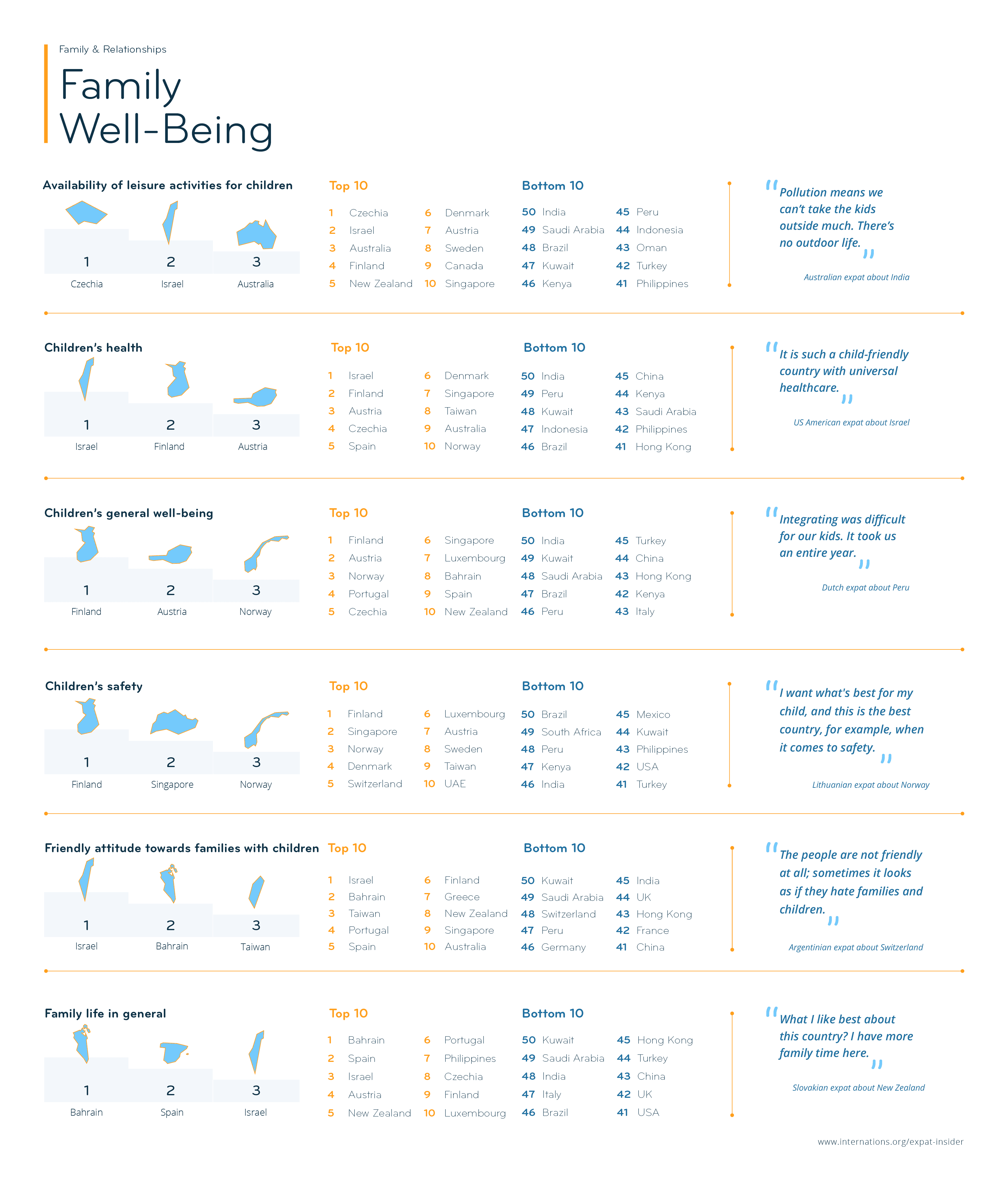 In 1st place out of 50 countries for Family Well-Being is Finland, reflecting its leading positions in the overall Family Life Index. Not only do an impressive 96% of expat parents in Finland rate their children’s general well-being and health, respectively, positively, but 100% are also satisfied with their children’s safety compared to the global average of 81%.