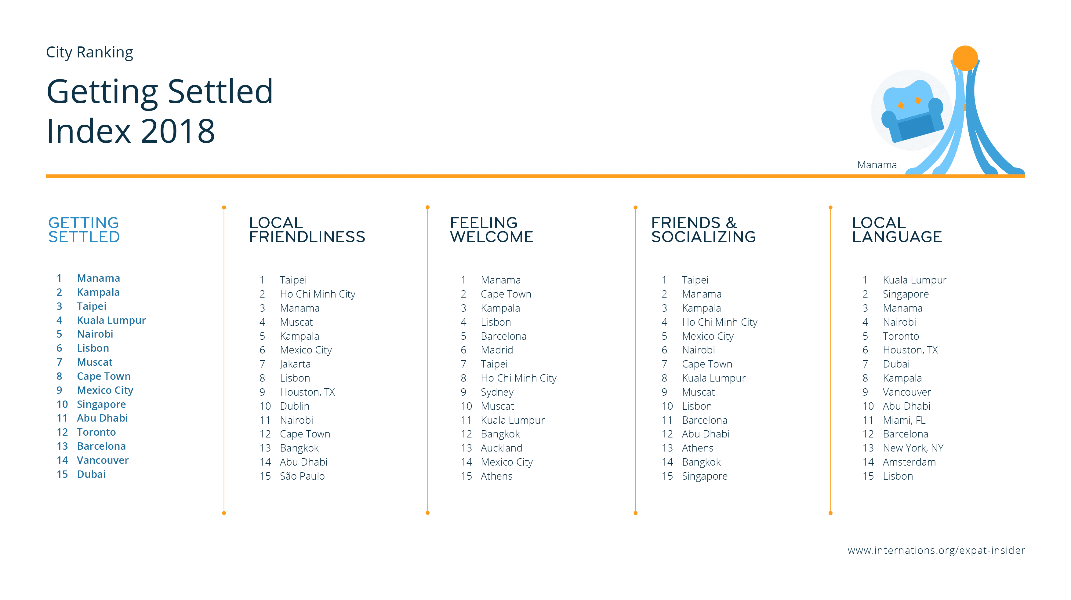 New to the Expat City Ranking in 2018 is bronze medal holder, Taipei. The Taiwanese capital does well across the board, obtaining a spot in the top 10 for three of the four Getting Settled subcategories and only falling short for the Local Language subcategory, in which it places 31st.