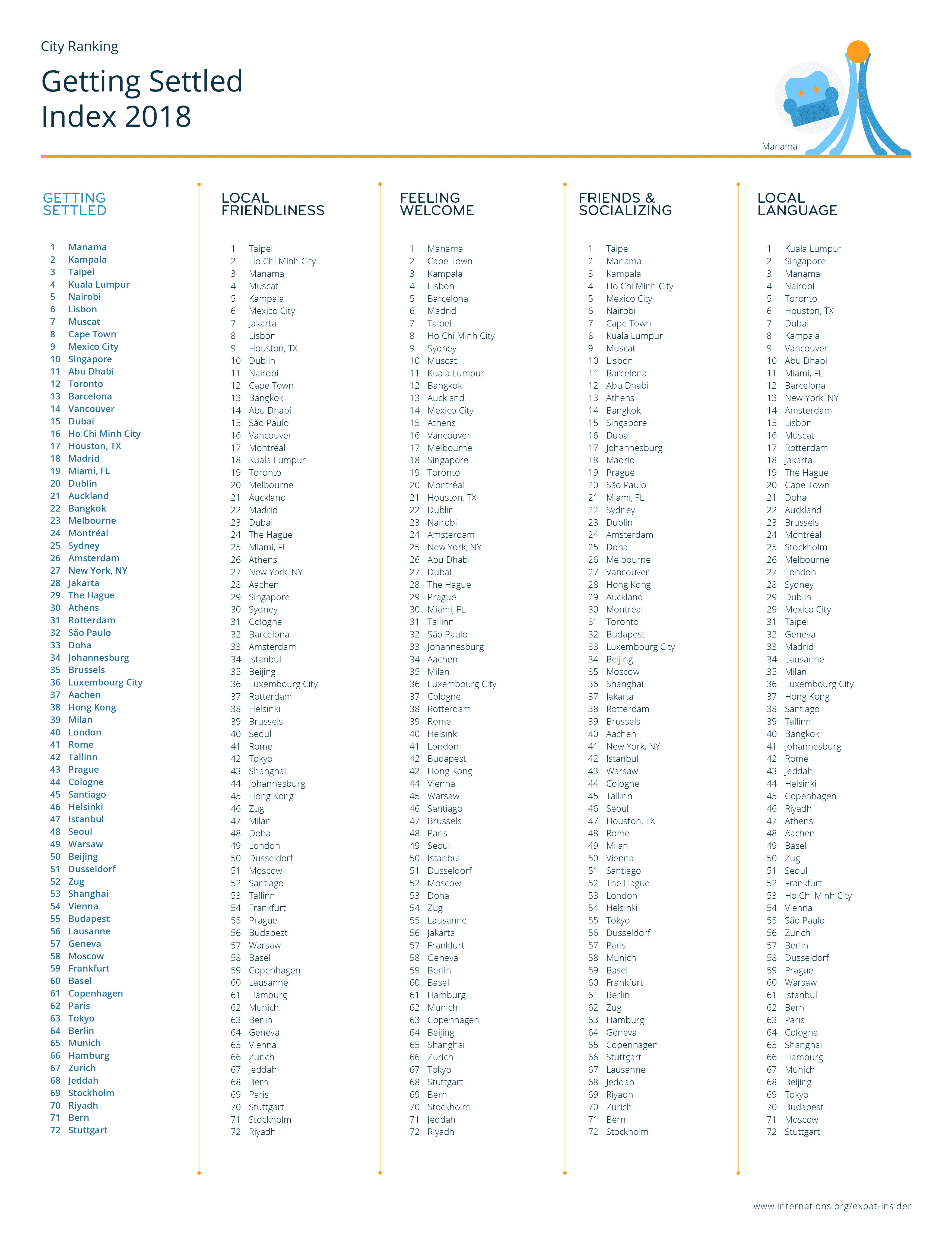 The Getting Settled Index of the Expat City Ranking 2018 covers a range of “soft” factors that can influence how easy it is for expats to find their feet abroad. Respondents were asked to rate their city of residence on a scale of one to seven for several factors. These include, for example, how easy it is to live in the city without local language skills, how happy expats are with their social life, whether or not they feel at home in the city, or how they would rate the general friendliness of the local population. At least 45 respondents were required for a city to be featured, with 72 cities making it into the final city ranking in 2018.