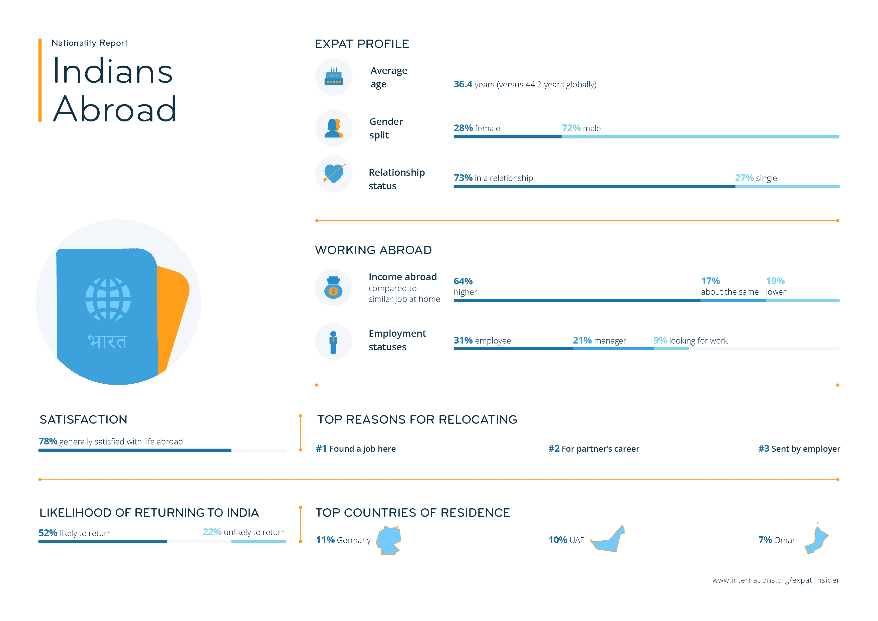 A significant share of Indians seek jobs abroad on their own: 17% found a job on their own (vs. 12% of all respondents), next to 13% who were sent by their employer. Once abroad, they are most likely an employee (31% vs. 25% globally), manager (21% vs. 14%), or currently looking for work (9% vs. 8%). A higher-than-average share of Indian expats (7% vs. 5%) are also students (including PhD students). Retirees are, in contrast, few and far between (1% vs. 11%).