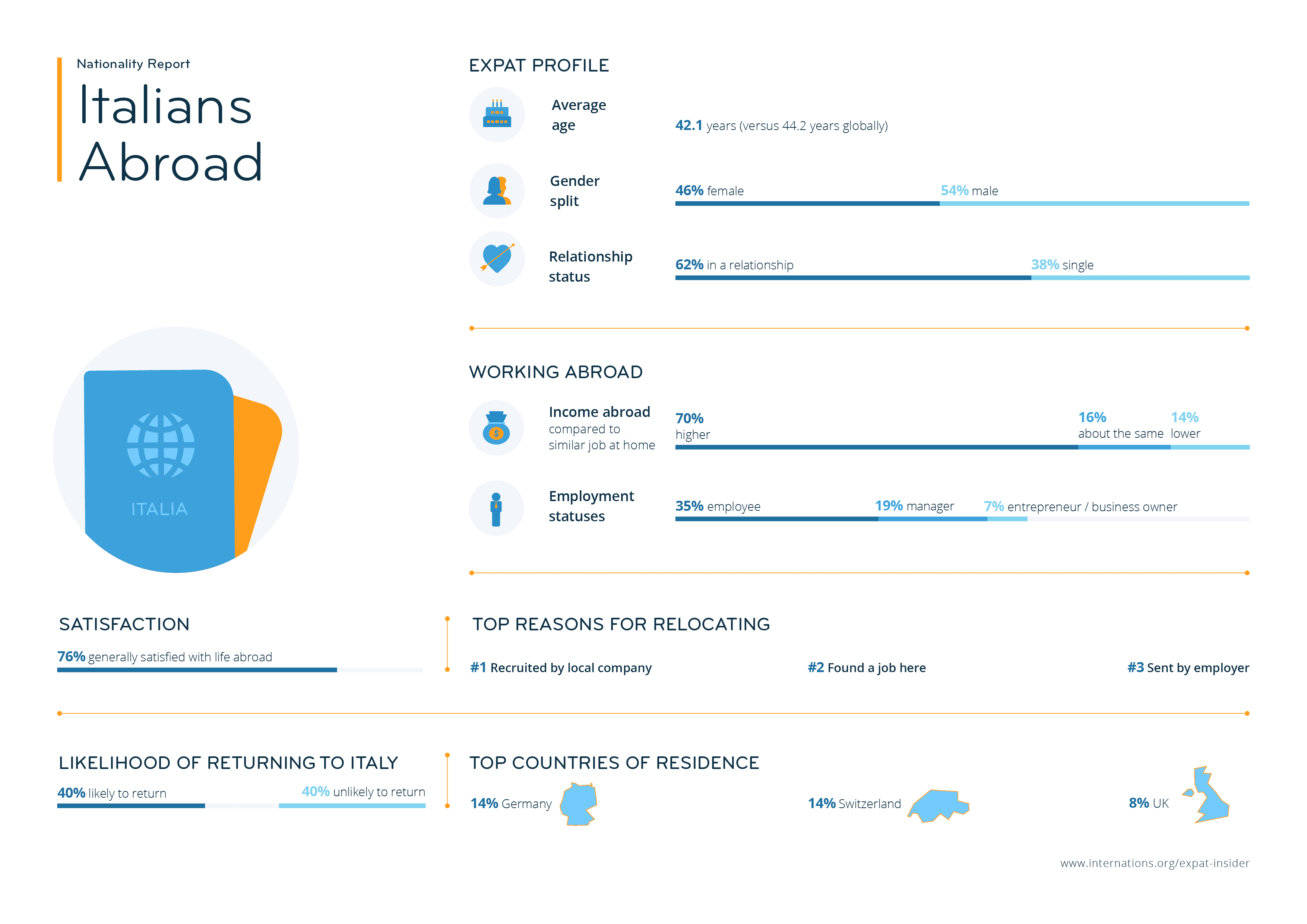 Italian expats clearly focus on their working life abroad. Nearly one in six (15%) moved abroad because they found a job there on their own, while another 15% were recruited by a local company, more than double the survey average of 7%.
