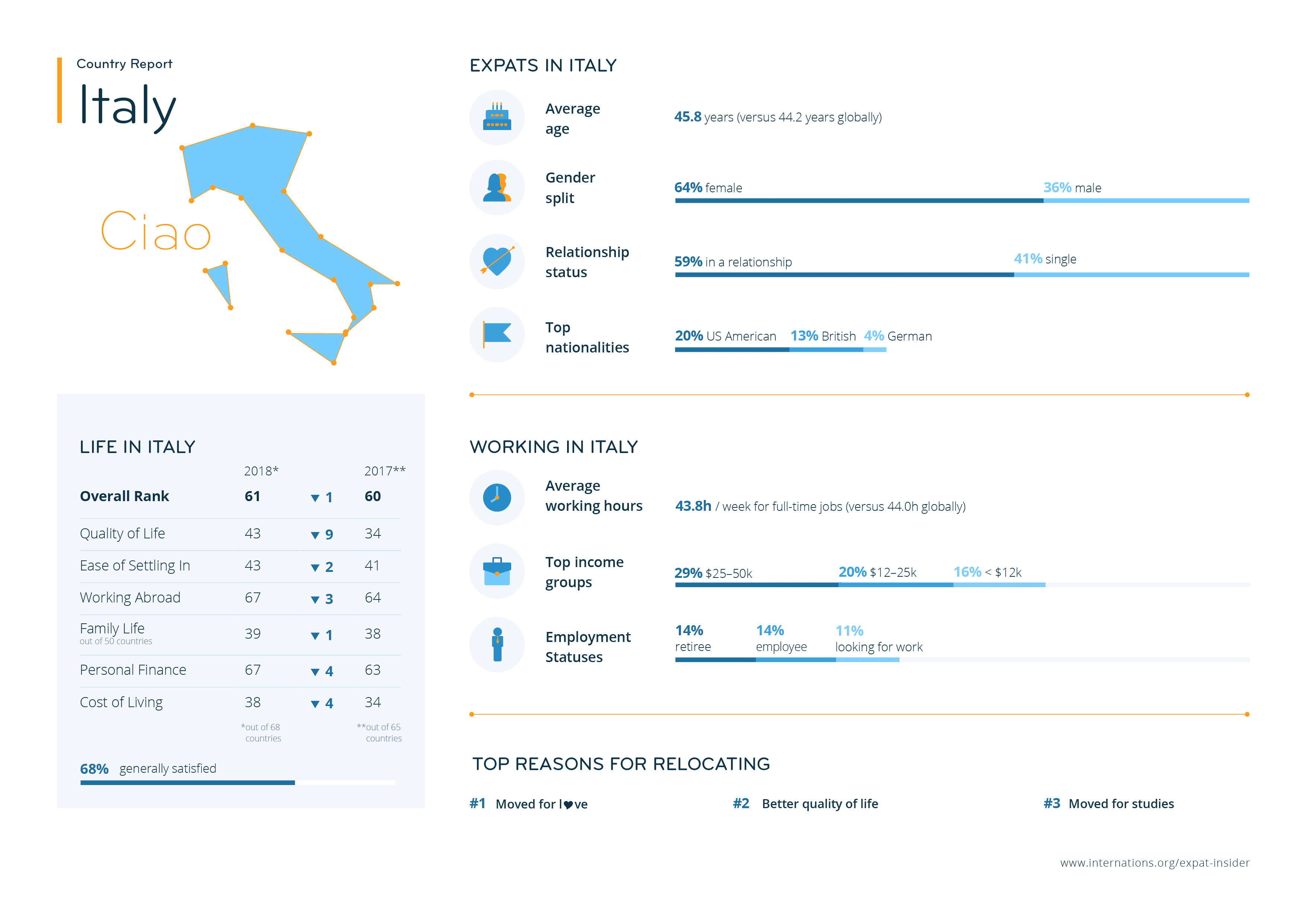 Working abroad in Italy is not as carefree as the weather tends to be. Bottom 10 results in the Career Prospects & Satisfaction (67th out of 68), Work & Leisure (60th), and Economy & Job Security subcategories (63rd) place Italy second to last overall in the Working Abroad Index.
