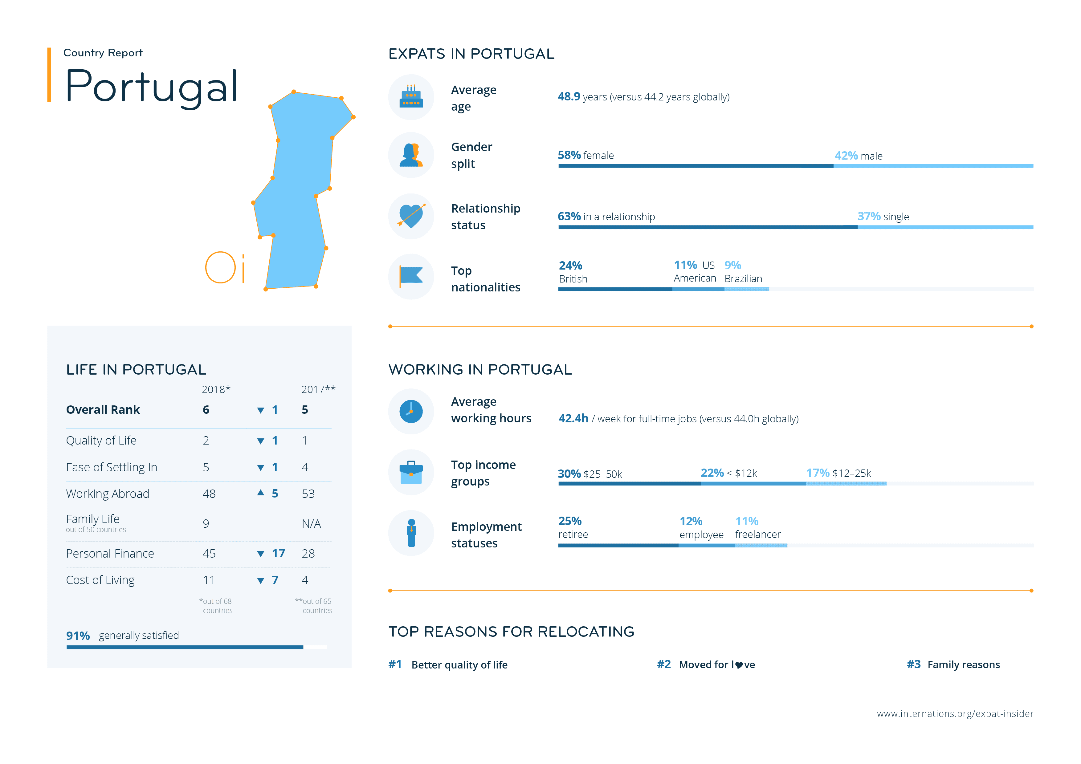 Portugal ranks an impressive 6th out of 68 countries in the overall results for 2018. In three indices, the country ranks in the top 10, including fifth for ease of settling in and second for quality of life.
