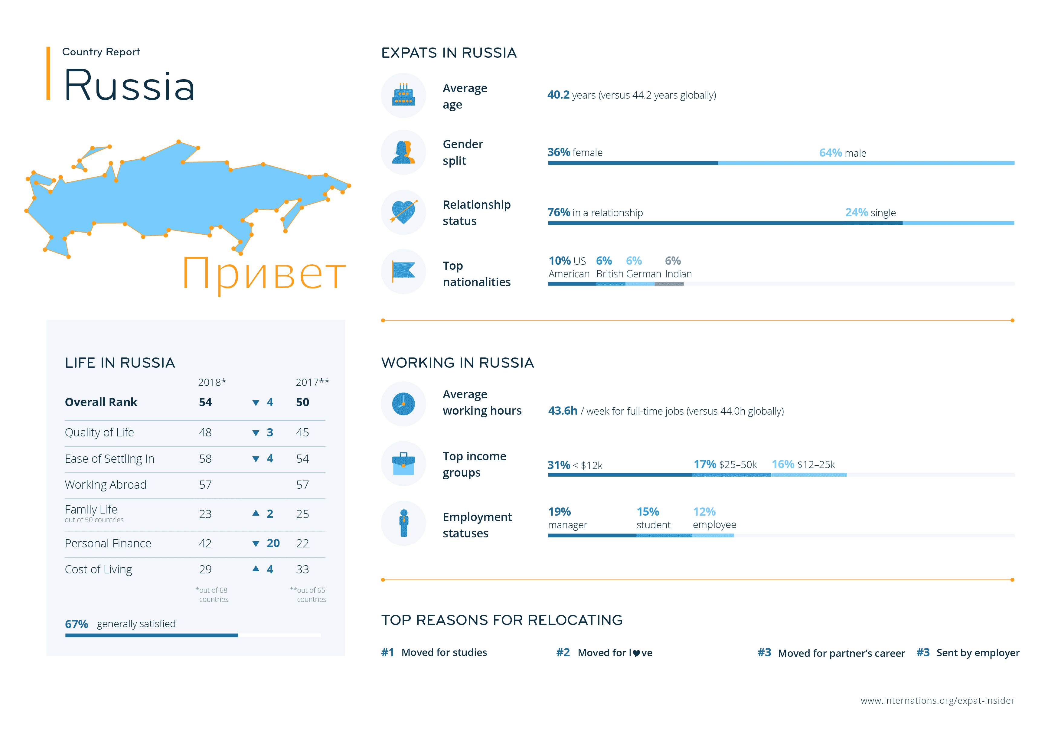 Furthermore, almost a third (31%) are in the lowest household income bracket, with under 12,000 USD a year. Some of these figures could be explained by the high proportion of students, who represent 15% of respondents in Russia. The financial strife may also have a lot to do with location — 78% of expats in Russia live in either Moscow or Saint Petersburg, which rank 17th and 49th, respectively, out of 209 cities in the 2018 Mercer Cost of Living survey.