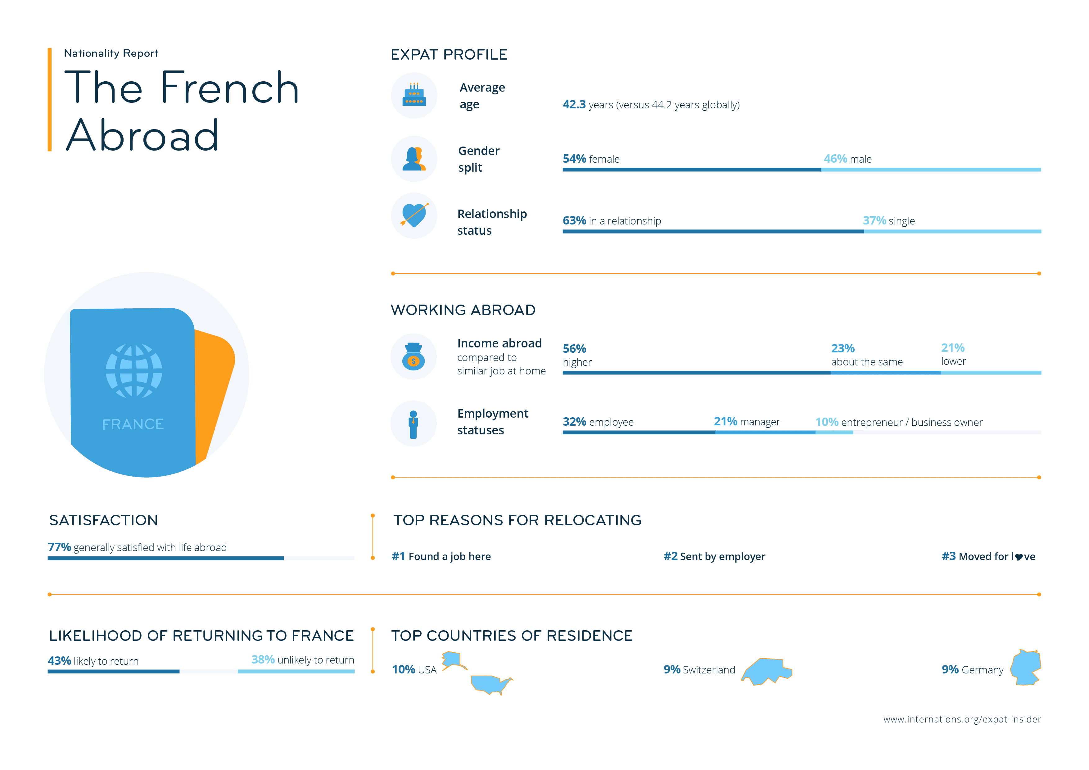 Of the 63% of French expats who are in a relationship, 66% are together with someone not from France. An above-average 28% met in a country that was neither France nor the respondent’s current host country (compared to 19% globally), and 36% say they only met their partner after relocating to their current country of residence.