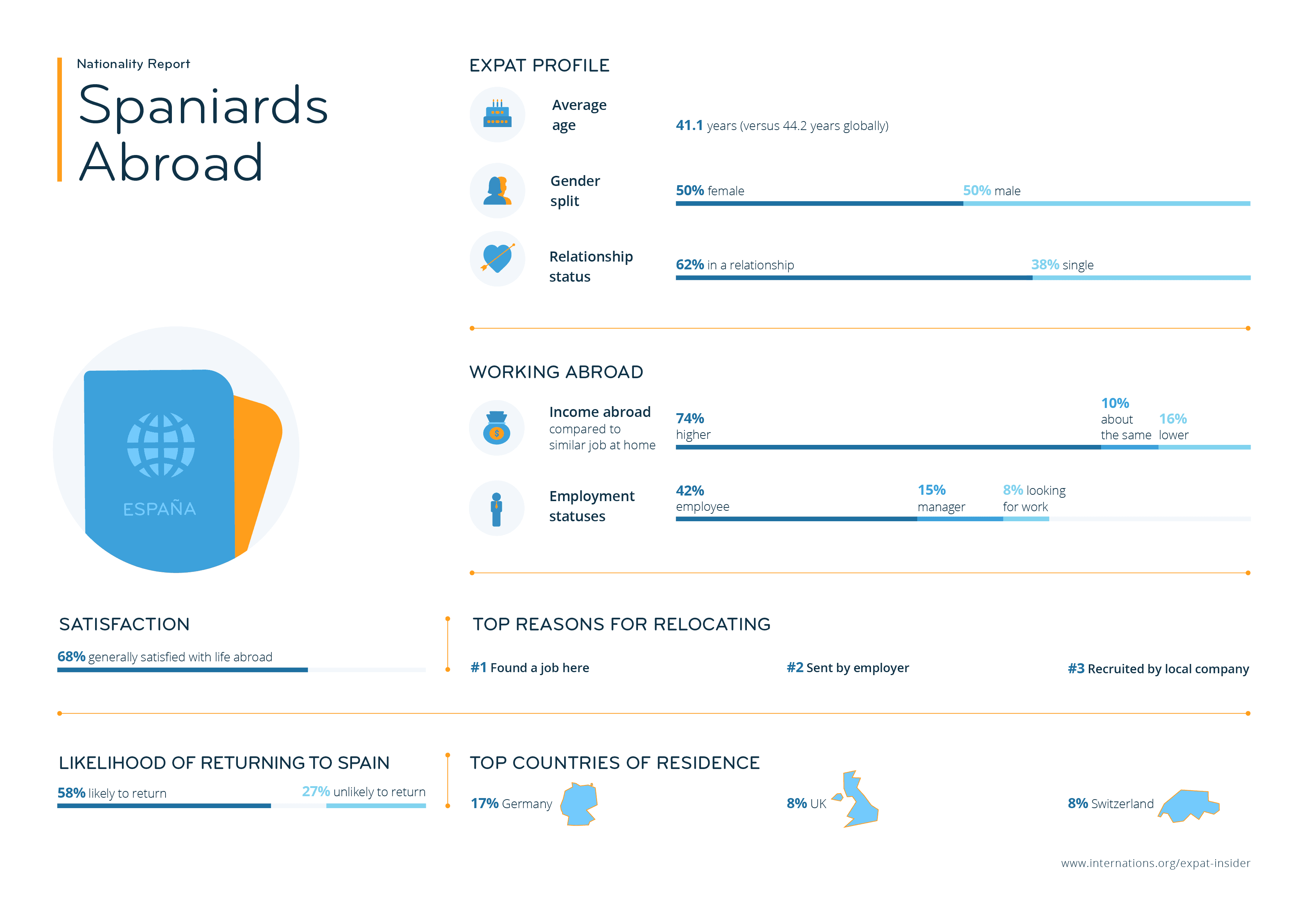 When looking at percentages of employees and retirees, Spanish expats don’t seem to go abroad to settle down: only 1% of Spanish expats are retirees (vs. 11% globally), and 42% are employees (vs. 25% globally).