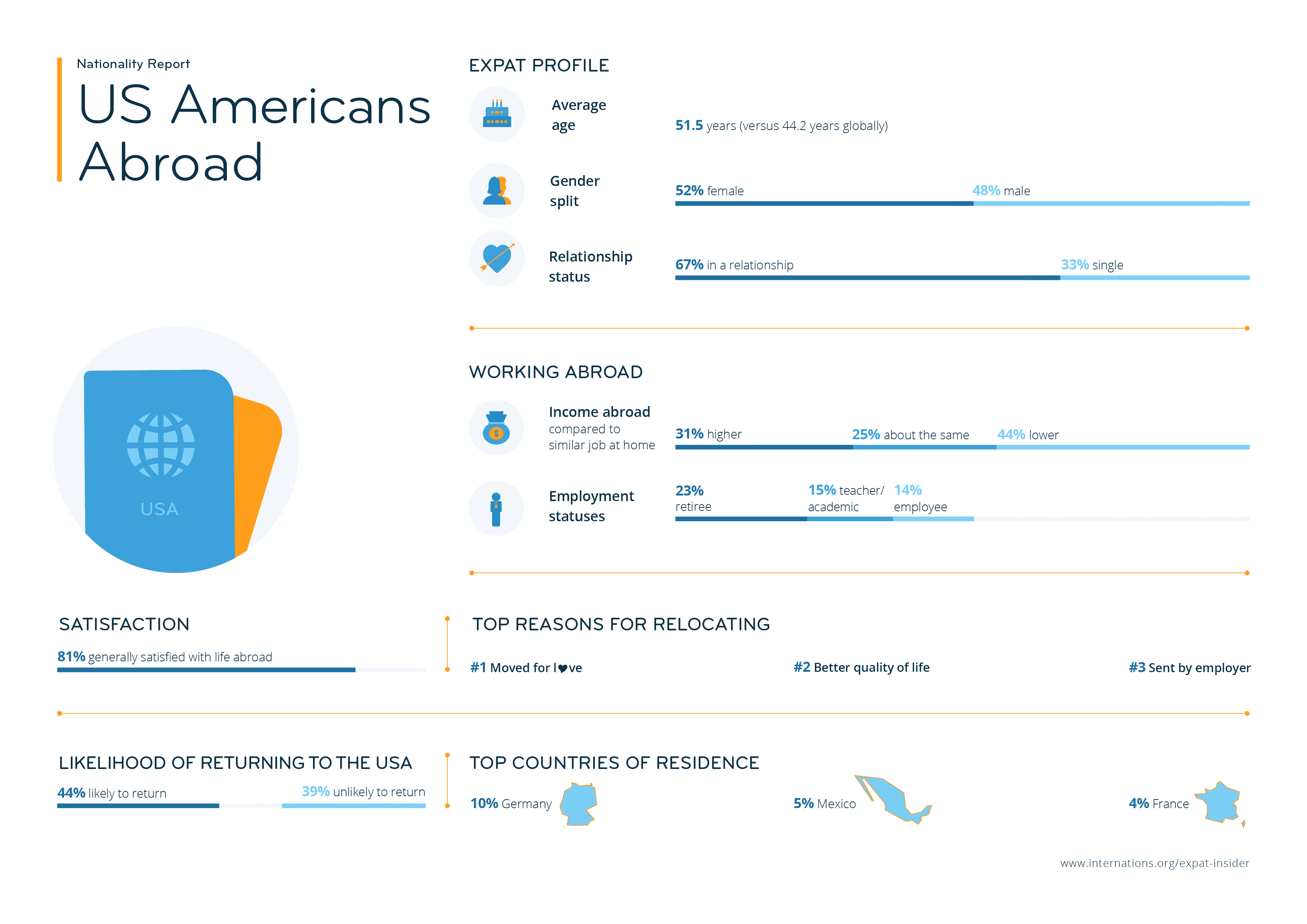 Nearly a quarter of US American expats (23%) describe their current employment status as retiree, compared to the global average of 11%. This may also explain why the average age of expats from the US is 51.5 years, 7.3 years above the survey average.