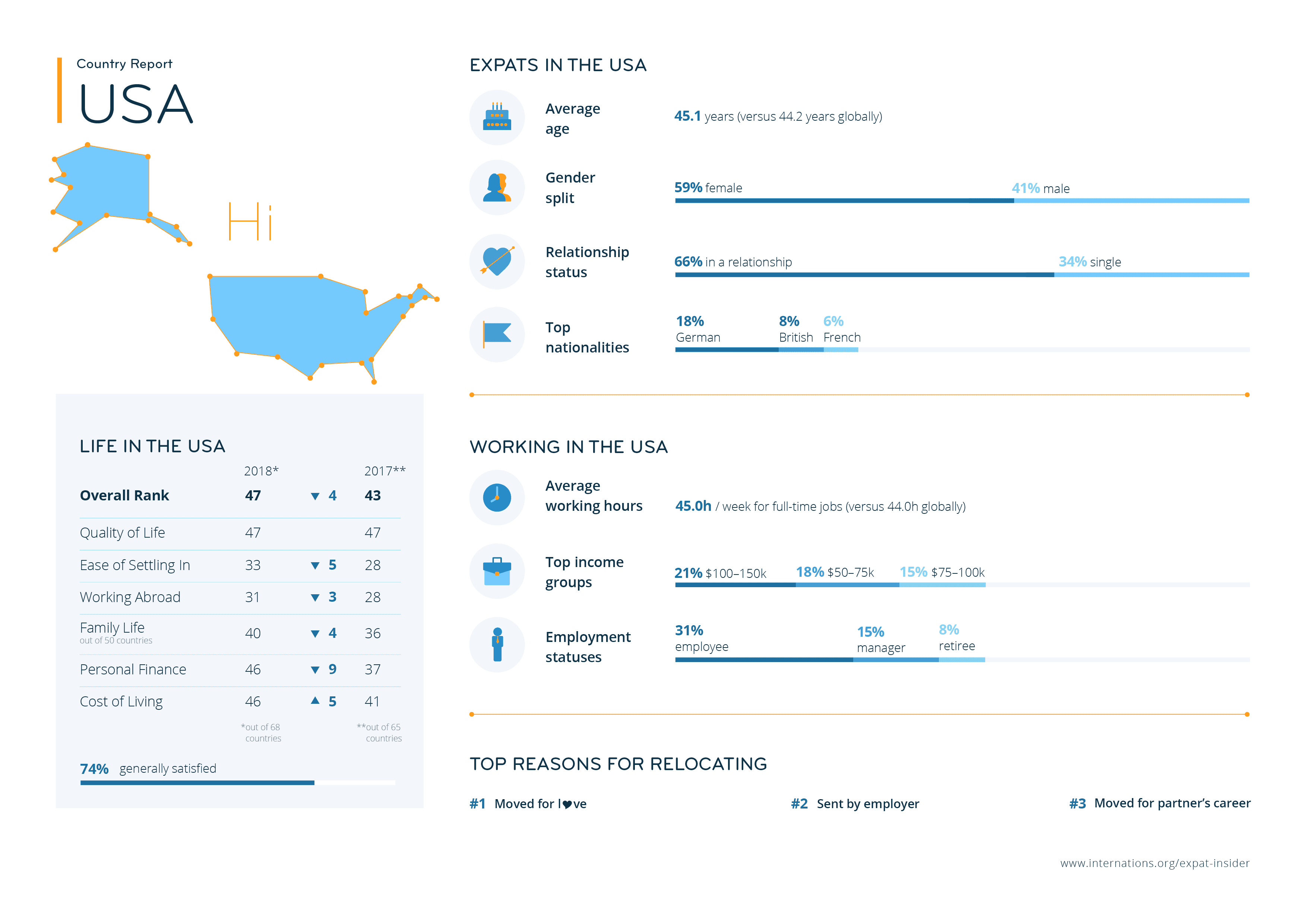 Similarly, 68% of expats say they are satisfied with their job overall. However, 27% of expats are unsatisfied with their work-life balance. The average full-time working week is one hour longer in the USA than across the world (45.0 vs. 44.0 hours per week, respectively).