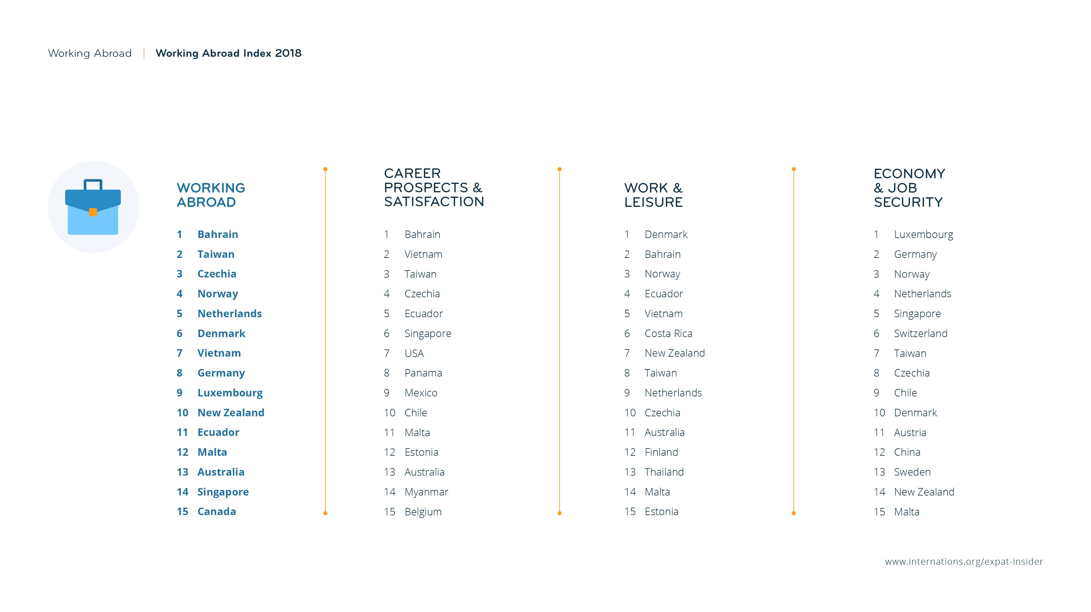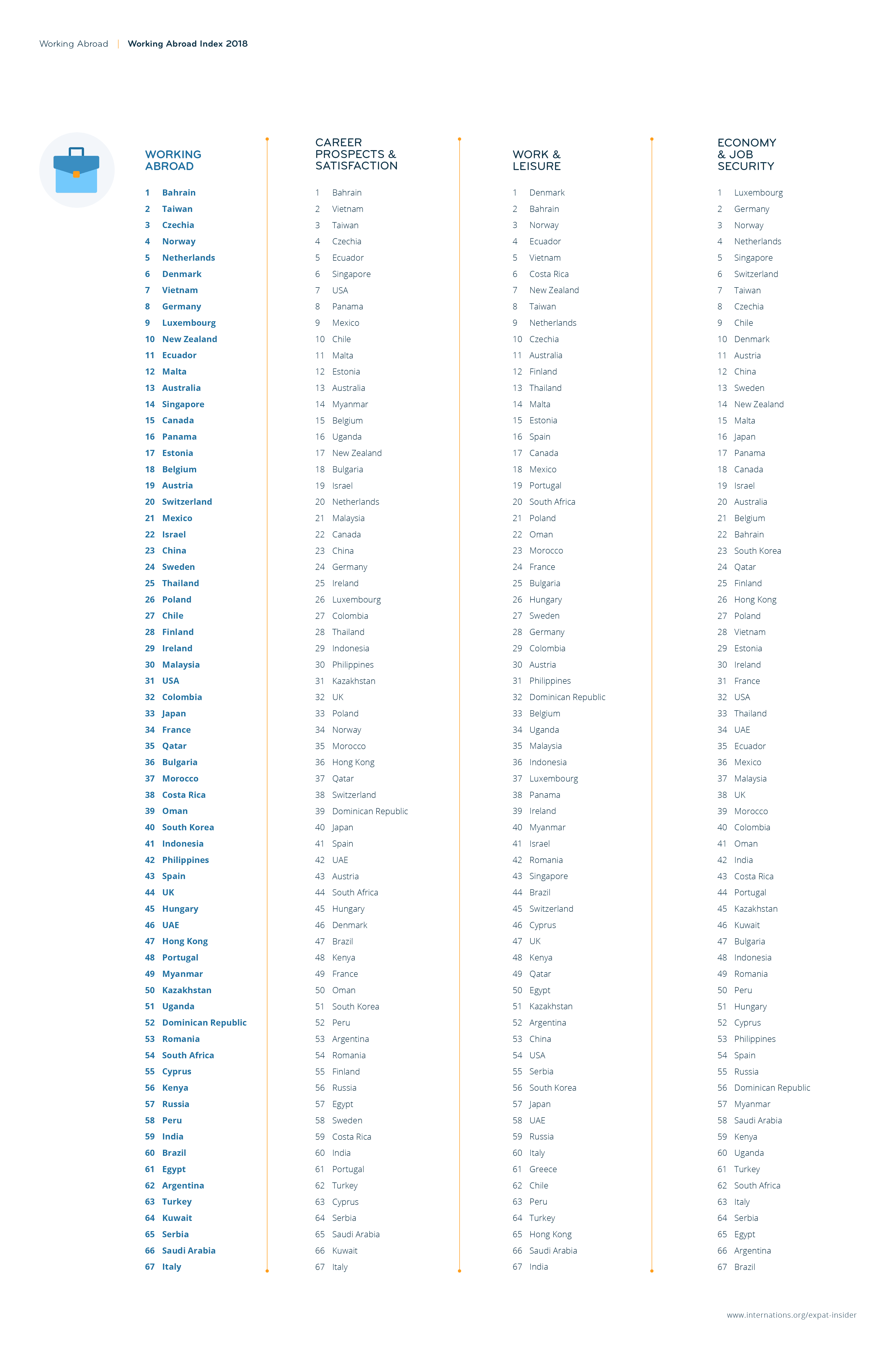 Little has changed in the top 3 of the Working Abroad Index: Bahrain, 2017’s number three, and Czechia, 2017’s number one, have traded places in 2018. Taiwan is making a comeback in the top 10, climbing from 12th to 2nd place, which it also occupied in 2016.