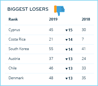 Costa Rica is another big loser in 2019. It ranked in the top 10 from 2016 to 2018 but places only 21st in 2019. This drop is also reflected in the respondents’ overall satisfaction: 79% are generally satisfied with their life abroad, compared to 86% in 2018.