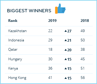 Kazakhstan shows the biggest improvement in 2019, gaining an impressive 27 ranks and achieving its best result since the survey was first conducted in 2014. The country has made big strides across the board and expats seem satisfied: 79% are happy with their life abroad, compared to 68% in 2018 and 75% globally. However, it is worth mentioning that the Expat Insider 2019 survey was conducted before the president stepped down and political unrest ensued across the country.