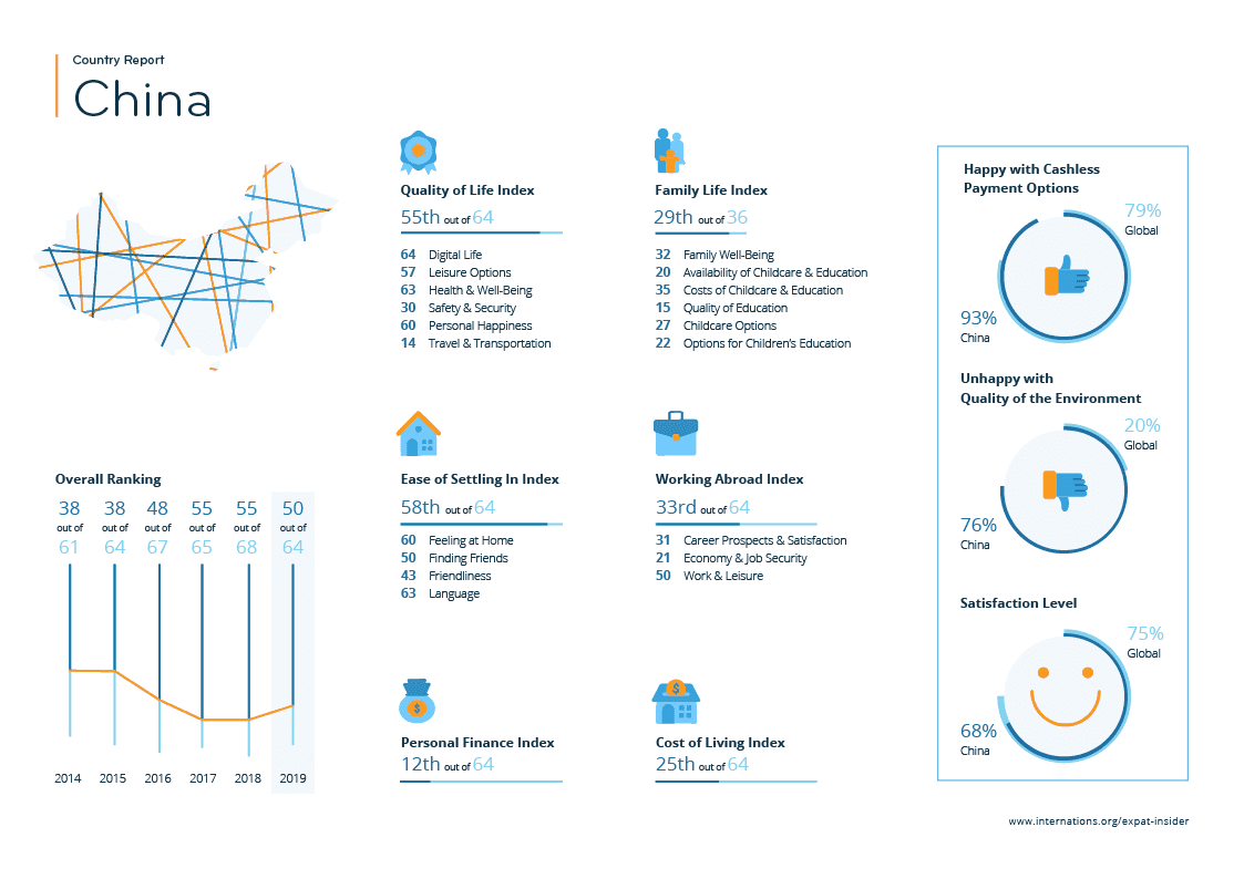 In the Working Abroad Index, China has dropped ten places compared to 2018 (from 23rd to 33rd) and places 31st for career prospects and job satisfaction (previously 23rd). Almost six in ten expats (58%) are satisfied with their career prospects, while two-thirds (67%) are generally satisfied with their job (vs. 55% and 64% worldwide).