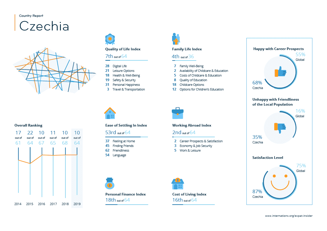 Czechia once again scores a spot in the top 3 of the Working Abroad Index, ranking second in 2019. Almost three-quarters of respondents (73%) are happy with their job overall (vs. 64% globally), while around seven in ten (68%) are satisfied with their career prospects (vs. 55% globally). In addition, 44% of expats who are happy with their life in Czechia share that their job is one of the reasons for this happiness, compared to 38% globally.