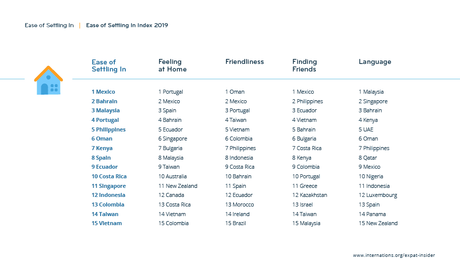 All the countries in the top 5 in the 2019 Ease of Settling In Index have always been at least in the top 20. Mexico is the most stable country, ranking either first or second every year. Portugal comes in fourth place in the 2019 survey. It often performs well, previously coming in either fourth or fifth place in 2015, 2017, and 2018. The Philippines, which comes in fifth in 2019, has always been in the top 10. Costa Rica ranked in the top 3 from 2016 to 2018, but in 2019 it has dropped back down to spot ten.