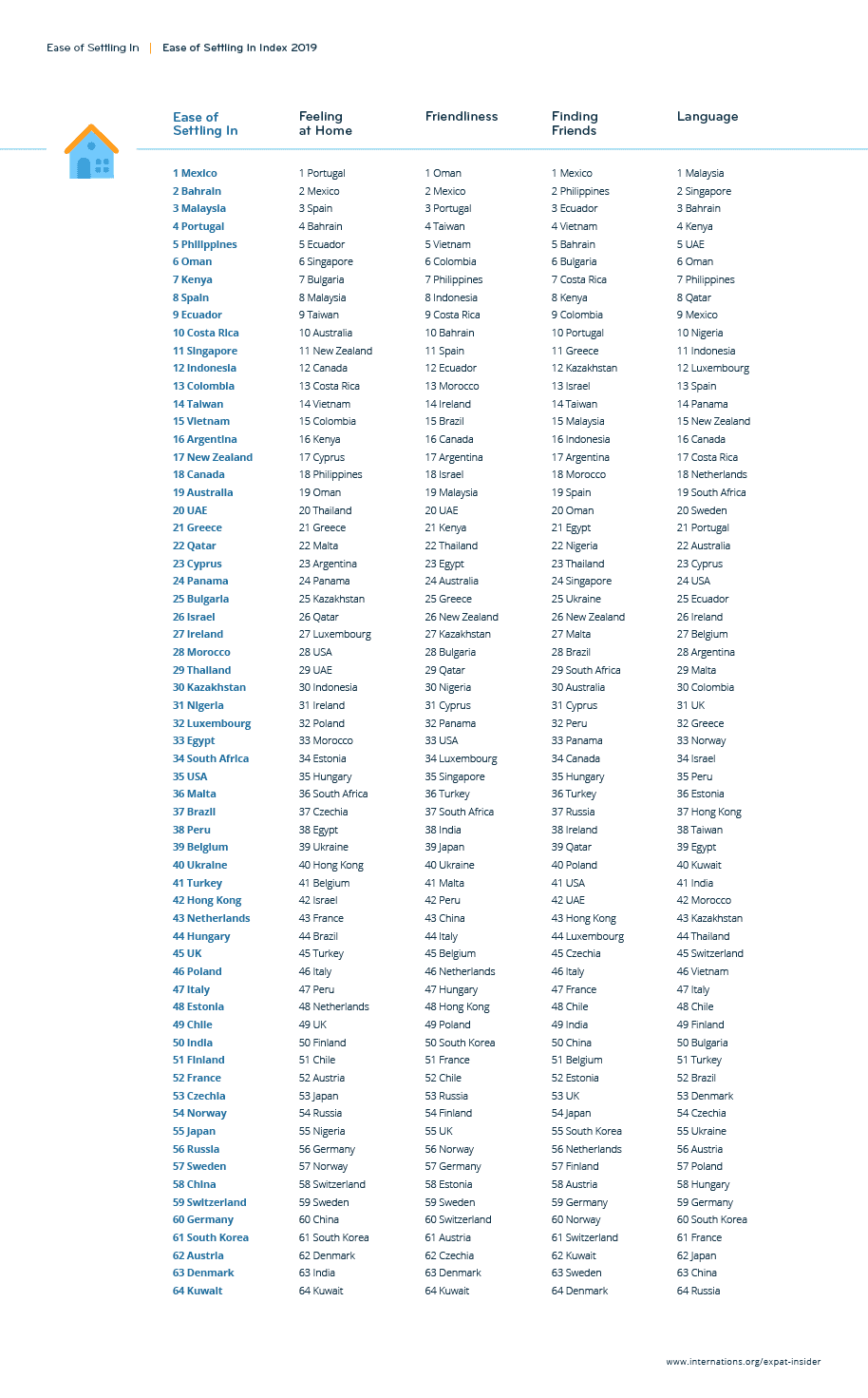 It comes as no surprise that Kuwait (64th) and Denmark (63rd) are at the bottom of the Ease of Settling in Index for 2019, with Austria (62nd) rounding out the bottom 3. Kuwait has ranked at the very bottom every year except for 2017 (when it came third from last), and Denmark has always ranked in the bottom 5. South Korea has gradually gotten worse for settling in over the years (e.g. 45th out of 61 countries in 2014, compared to 61st out of 64 countries in 2019). Germany (60th) always has disappointing results in this index, ranking in or near the bottom 10 every year.