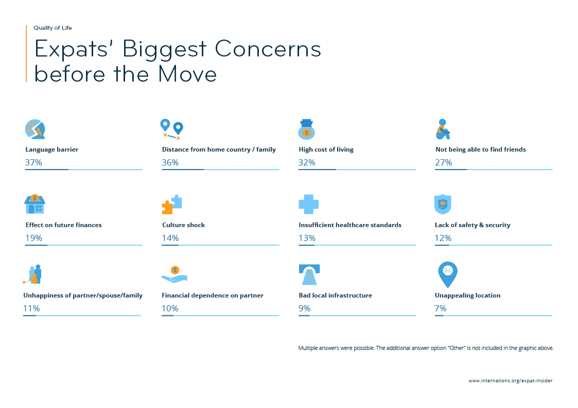 Although expat life can be a rewarding experience, moving abroad often comes with fears and challenges. In 2019, respondents shared their biggest concerns regarding the relocation:
