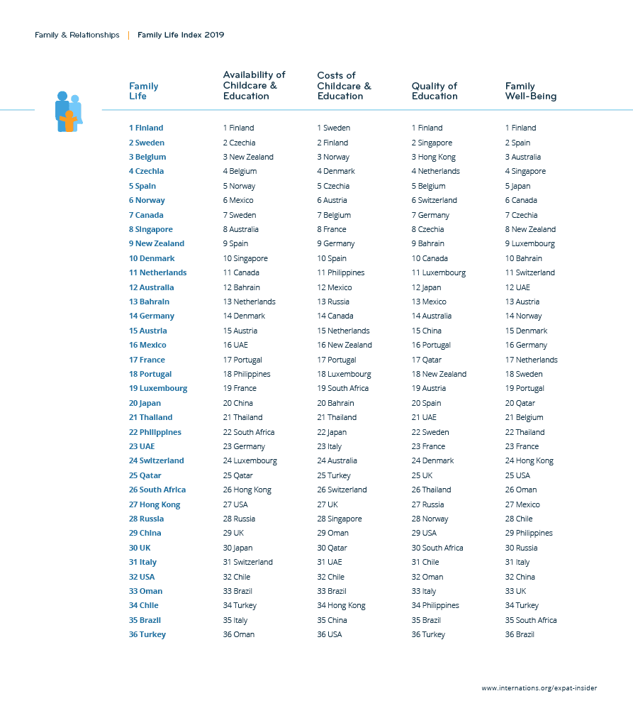 Turkey comes in last in 2019. It has ranked near the bottom every year that it has featured in the Family Life Index. Brazil, in second to last place in 2019, has ranked among the bottom 5 for the past five years and even placed last in 2018. Chile — which last ranked in this index in 2014 — comes in third to last. A Danish expat is unhappy that “the school options are very expensive and complicated for children to access”. Chile didn’t perform very well way back in 2014, either, coming in 26th out of 34 countries.