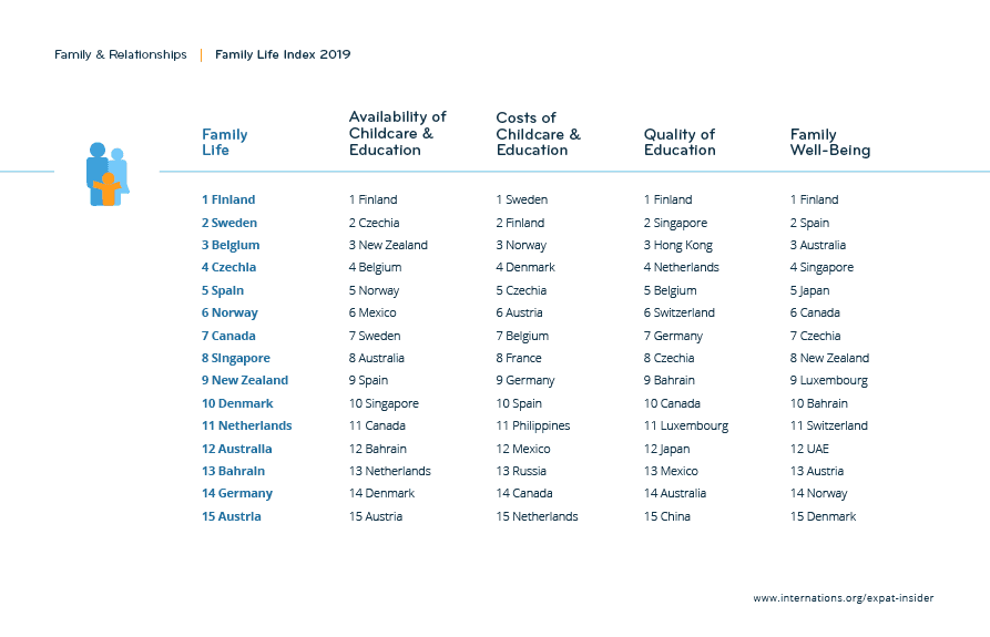 To feature in the 2019 Family Life Index, a country needed to have at least 40 respondents with dependent children living abroad with them. In 2019, this was achieved by only 36 countries. The index covers various factors in six different subcategories: Availability of Childcare & Education, Costs of Childcare & Education, Quality of Education, Family Well-Being, Childcare Options, and Options for Children’s Education.