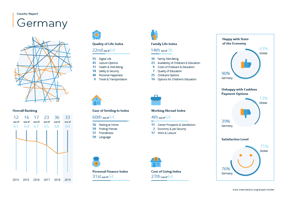 Socializing is made even more difficult for expats by a seemingly unfriendly population — over a quarter of expats (27%) rate the friendliness of the German population negatively, compared to a global average of 16%.