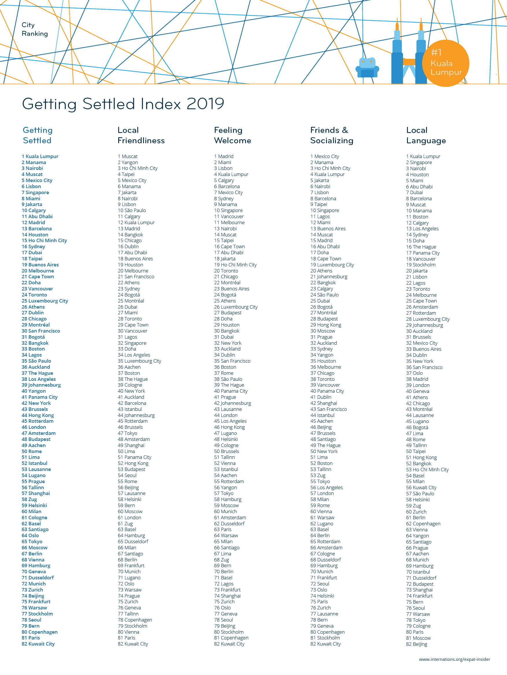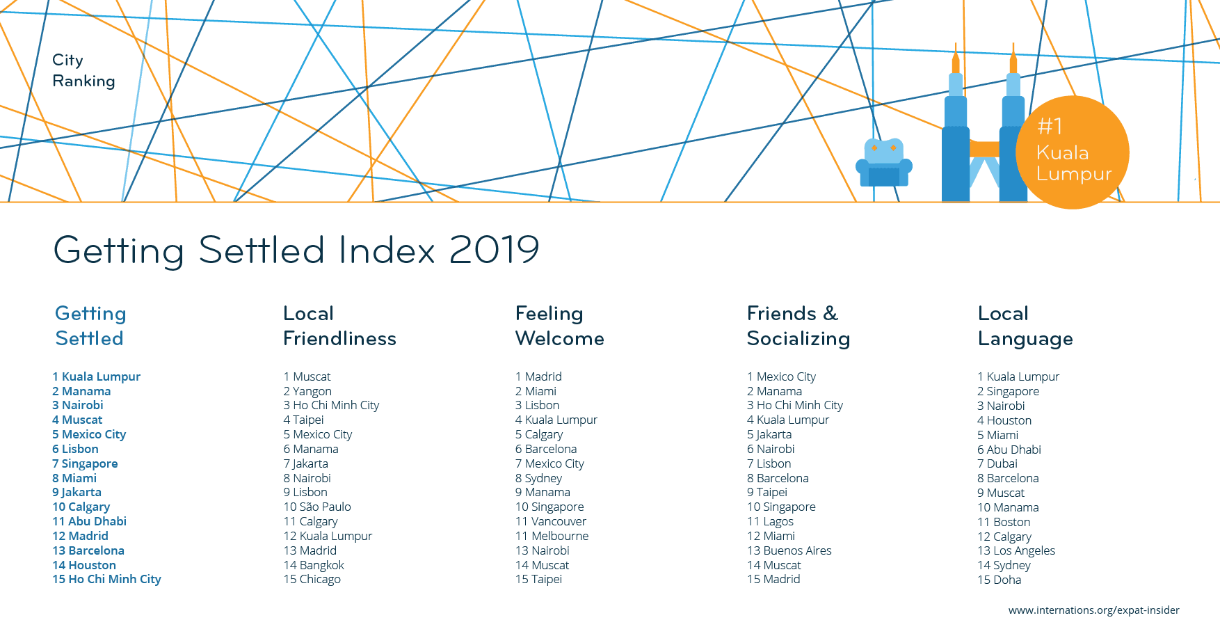 In 2019, 82 cities with a minimum sample size of 50 respondents have placed in the city ranking. The Getting Settled Index includes various subcategories — Local Friendliness, Feeling Welcome, Friends & Socializing, and Local Language — which are again made up of two single factors each. The cities’ results for these factors and subcategories determine their rank within the Getting Settled Index.