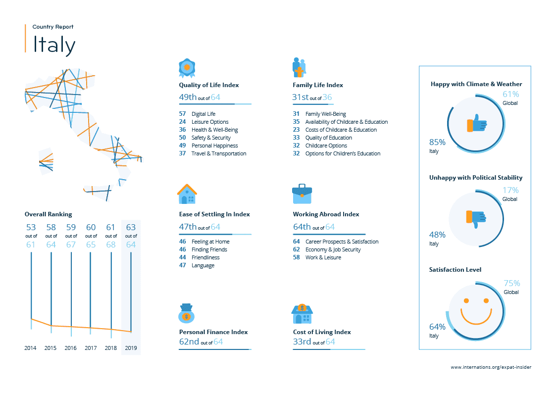 Similarly, expats in Italy are noticeably less satisfied with their jobs in general (49% positive ratings vs. 64% globally), their career prospects (29% vs. 55%), their job security (41% vs. 59%), and their working hours (49% vs. 62%). Italy’s last place in the Working Abroad Index is therefore hardly surprising, though it’s the first time that Italy ranks worse than Greece.