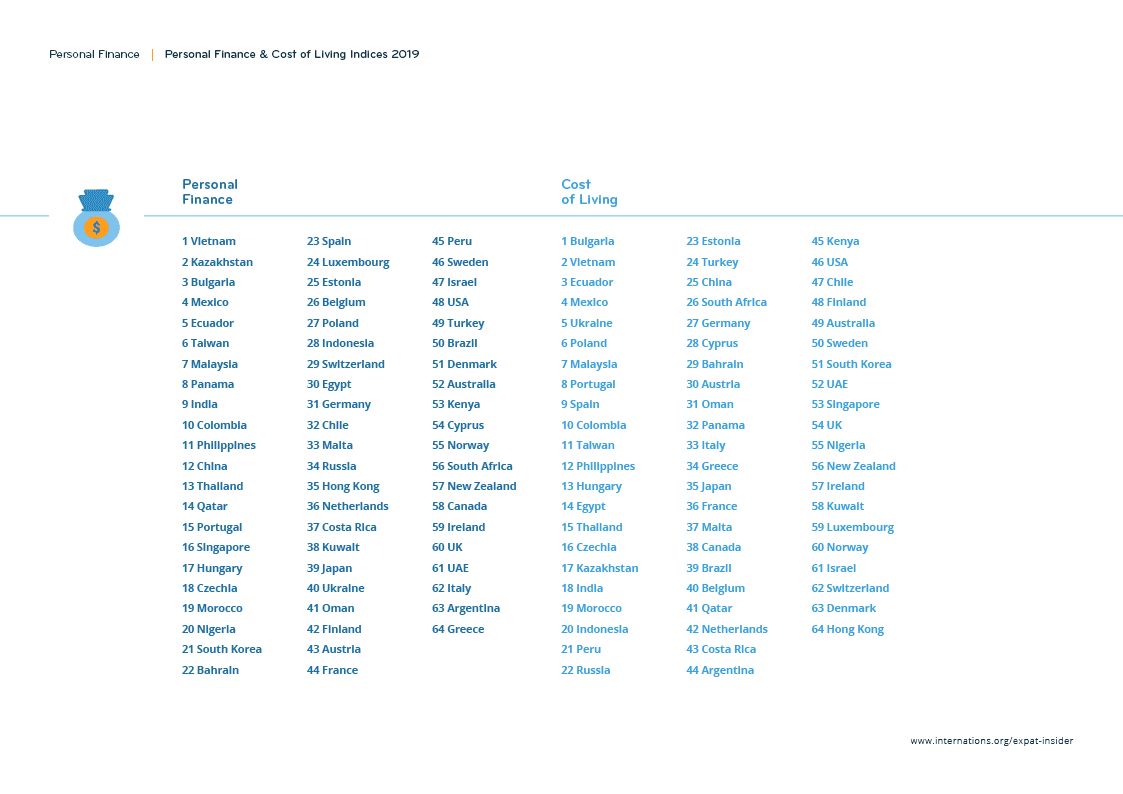 This article also references the Cost of Living Index, a ranking based on respondents’ satisfaction with the cost of living in their host country. The index is provided as additional information but does not factor into the overall country ranking to avoid overrepresenting financial aspects in the general results.