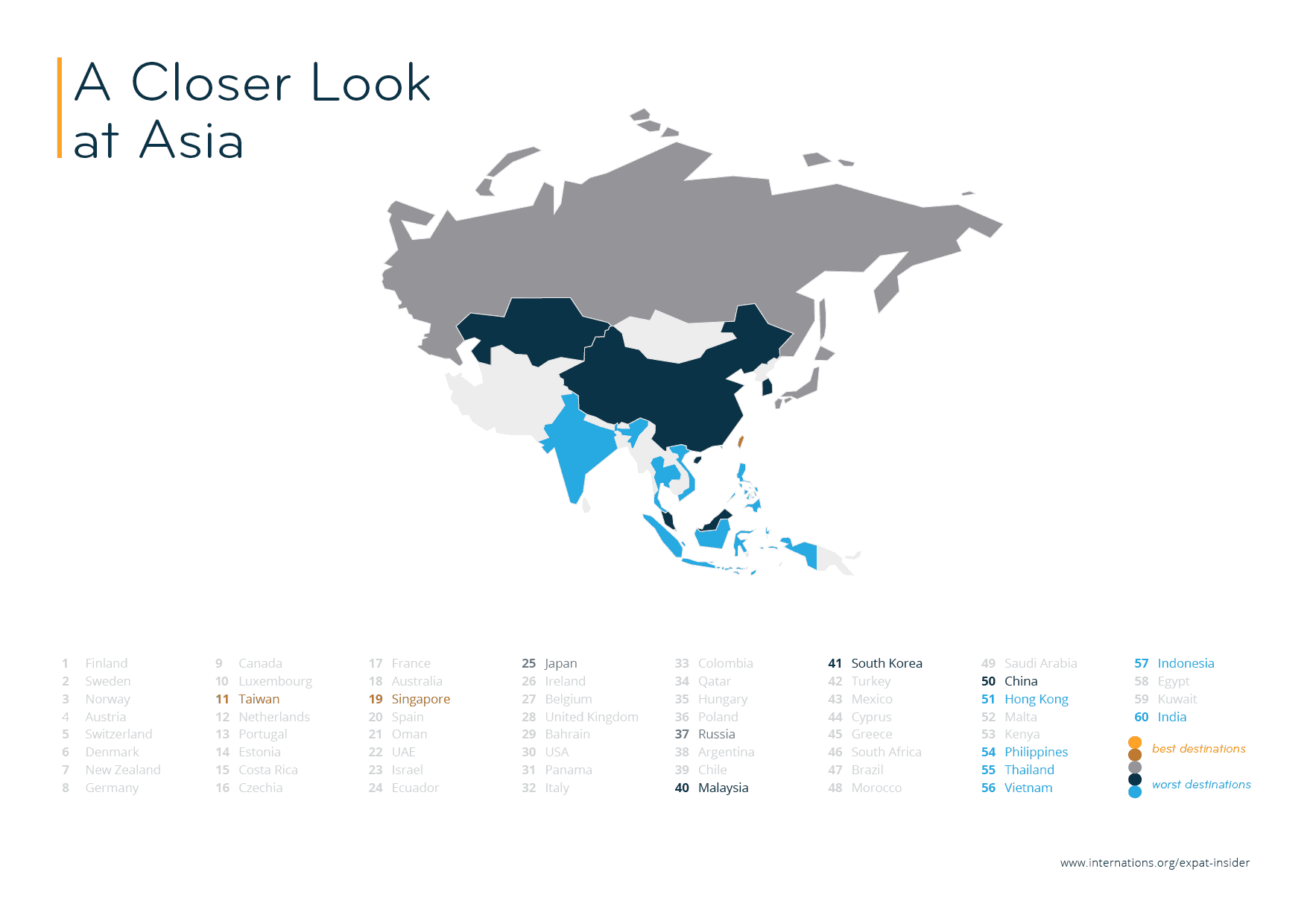 Out of all destinations in Asia, Taiwan (11th out of 60 worldwide) ranks highest in the Environment & Sustainability Ranking. It performs best in the Products & Utilities and the Policies & People subcategories, with an 8th place for each. Regarding products and utilities, expats are especially happy with the waste management and recycling infrastructure (92% vs. 60% globally), and four in five (80%) rate the availability of green goods and services positively (vs. 63% globally). When it comes to policies and people, 81% of respondents perceive the Taiwanese government as supportive of policies to protect the environment (vs. 55% globally). Additionally, nearly three in four expats (74%) also consider the population to be very interested in environmental issues (vs. 48% globally). Taiwan does not perform quite as well in the Quality of Environment subcategory (24th), showing rather mixed results. On the one hand, expats rate the water and sanitation infrastructure positively (84% vs. 72% globally), and they like the natural environment (94% happy vs. 82% globally). However, the country lags behind as far its air quality is concerned (57% satisfied vs. 62% globally). A US American expat in Taipei explains: “The air pollution is getting worse because it is too crowded.”