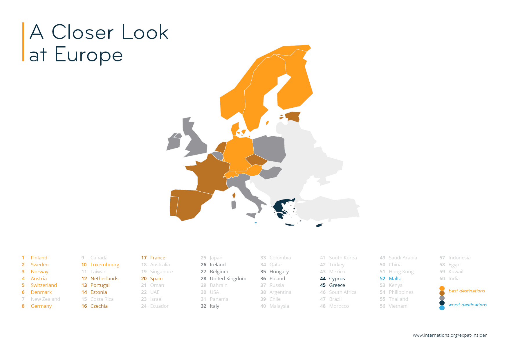 Denmark comes in 6th place overall, doing best in the Policies & People subcategory (3rd). Expats agree that the local population is very much interested in environmental issues (83% vs. 48% globally) and also think that the government supports policies to protect the environment (84% vs. 55% globally). A South African expat notes that “the Danish are environmentally conscious. Organic food and products are easily available, and they are good with recycling.” In fact, Denmark ranks 4th out of 60 countries in the Products & Utilities subcategory, with 89% of expats being satisfied with the waste management and recycling efforts (vs. 60% globally), the availability of green goods and services (vs. 63% globally), and the energy supply (vs. 62% globally). The country ranks just a little lower in the Quality of the Environment subcategory (10th), where the ranking is affected by the natural environment (38th). Yet, 87% of expats still rate this factor positively, five percentage points above the global average (82%). What is more, most expats are happy with Denmark’s air quality (94% vs. 62% globally), as well as water and sanitation (93% vs. 72% globally).