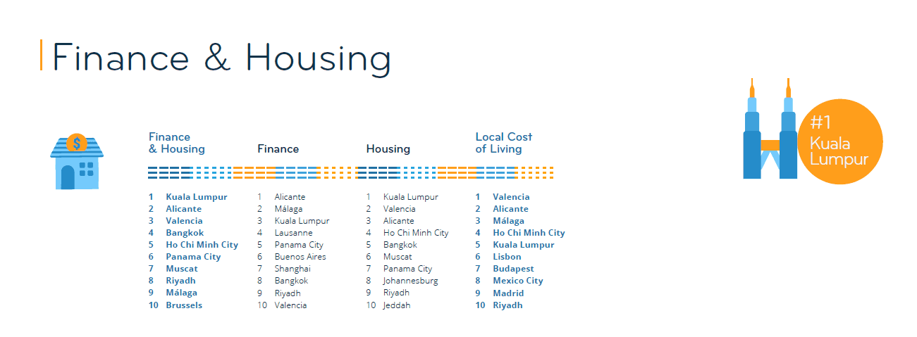 Kuala Lumpur is not the only Asian city that makes it into the top 10 of the Finance & Housing Index; it is joined by Bangkok (4th) and Ho Chi Minh City (5th). Expats are rather happy with the housing situation in all three cities. In both Bangkok and Ho Chi Minh City, 88% of survey respondents say it is easy to find a place to live. Three in five expats in Bangkok (60%) and just over five in eight in Ho Chi Minh City (63%) also agree that housing is generally affordable in their city.