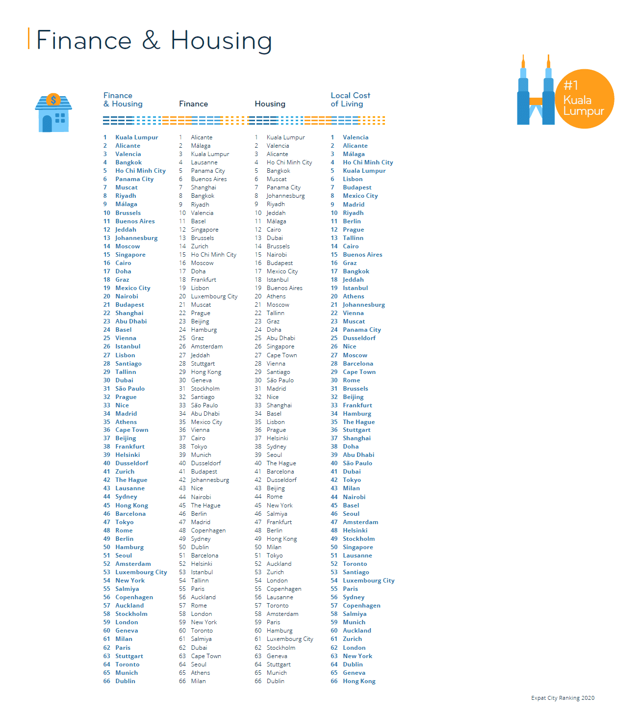 Kuala Lumpur ranks first in the Finance & Housing Index in 2020. The Malaysian capital particularly impresses expats when it comes to housing: 84% of survey respondents living in Kuala Lumpur believe that it is easy to find a place to live, and nearly half (48%) even agree completely with this statement, compared to 20% globally. Seven in ten expats in Kuala Lumpur (70%) find housing in the city to be affordable, too, and one in five (20%) considers the affordability to be very good.