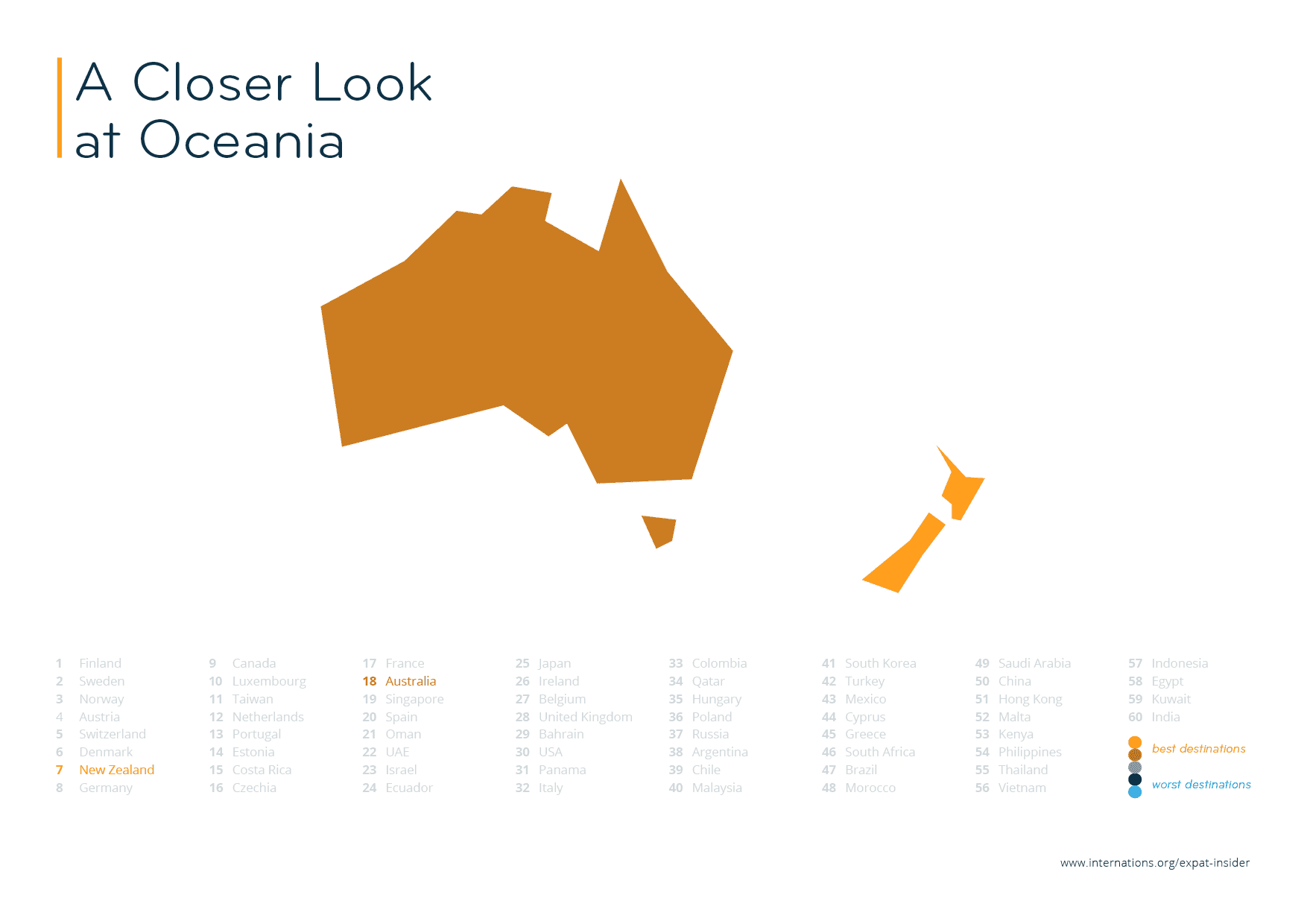 Coming in 18th place out of 60 countries, Australia performs best in the Quality of Environment subcategory (11th). Expats love its natural environment (8th), with 95% rating this factor positively, compared to 82% globally. “The Australian environment is pleasant,” says a German expat. Expats are also satisfied with the quality of the air (13th), as well as water and sanitation (14th), with almost six in seven respondents (85%) rating the latter positively (vs. 72% globally).