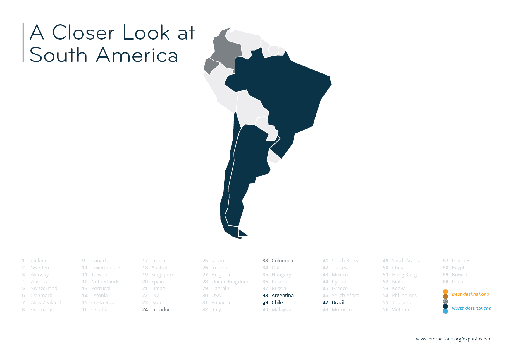 Brazil (47th out of 60 countries) is voted the worst South American destination in the Environment & Sustainability Ranking. Sustainability does not seem to be a priority there. For instance, the country ranks among the bottom 10 worldwide in the Policies & People subcategory (53rd): just 23% of expats agree that the government supports policies to protect the environment (vs. 55% globally) and less than a third (32%) think that the population is very interested in environmental issues (vs. 48% globally). The ‘’lack of environmental responsibility’’ is what bothers a German expat most about living in Brazil, while a Canadian expat describes the ‘’lack of empathy for the environment”. Regarding the Products & Utilities subcategory (45th), just about two in five expats (41%) are satisfied with the country’s waste management and recycling efforts (vs. 60% globally). Moreover, only 56% of expats are happy with Brazil’s energy supply (vs. 62% globally). Brazil receives its best results in the Quality of Environment subcategory (37th) and — just like most South American countries featured in the report — gets a few extra points for its natural environment (24th). Several expats specifically mention “the nature” as what they like most about life in Brazil. In fact, nine in ten expats (90%) rate the natural environment positively (vs. 82% globally). However, it is the factor water and sanitation (52nd) that makes Brazil drop a few ranks in this subcategory: three in ten expats (30%) are unhappy with this factor, twice as much as the global average (15%).