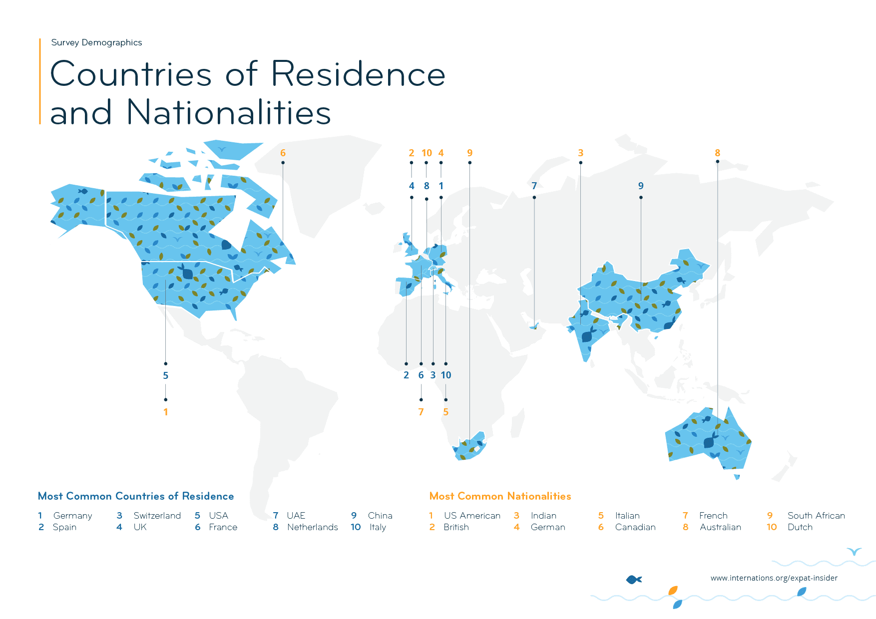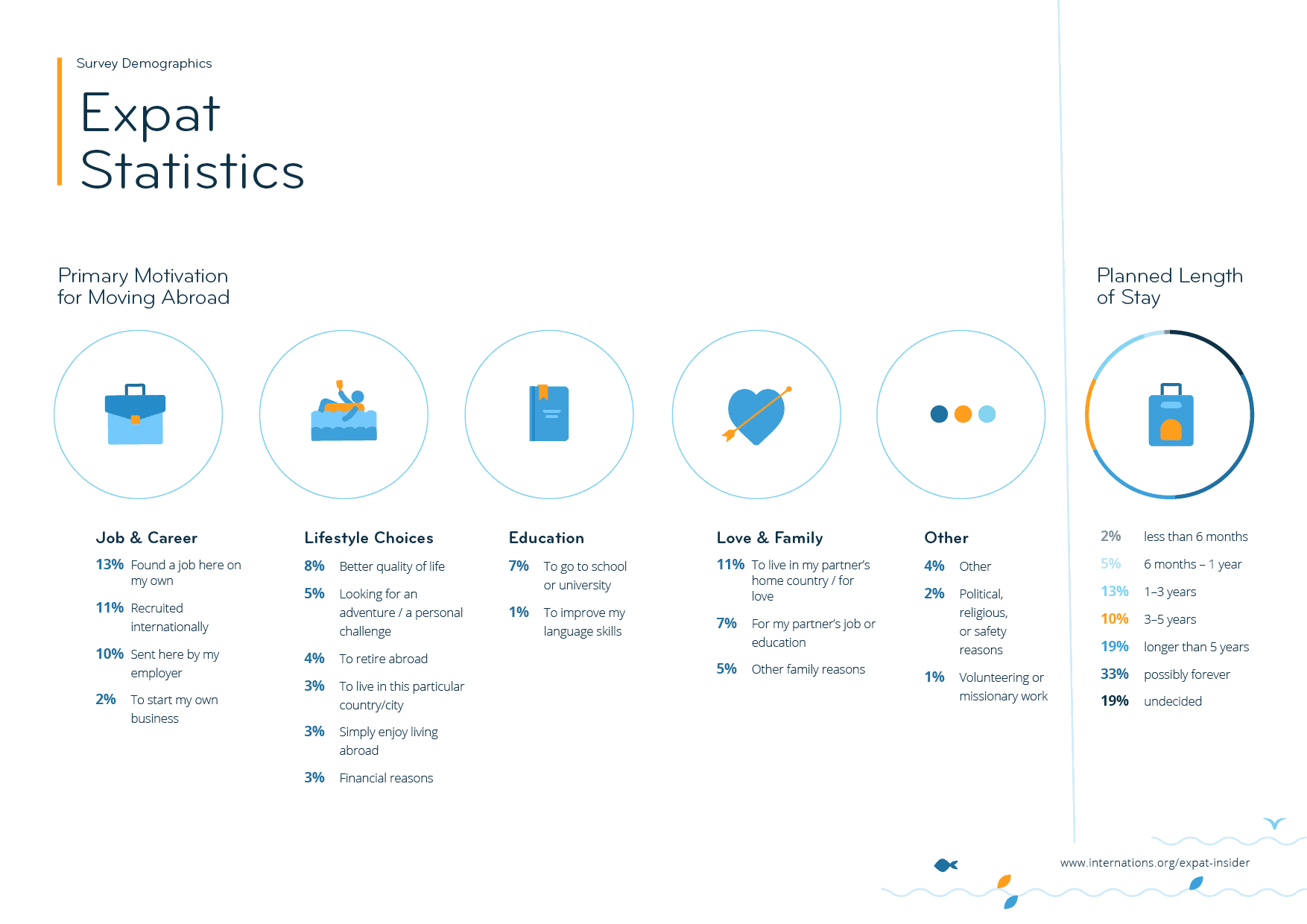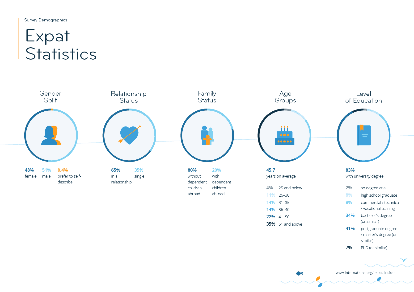 In 2020, 15,001 expats from across the globe took part in the Expat Insider survey, representing 173 nationalities living in 181 countries or territories. The infographics below give insights into participants’ demographics, from age and gender to length of stay and level of education, as well as their main reason for moving abroad, and more!
