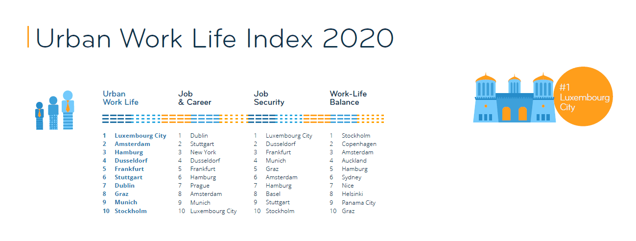 The Urban Work Life Index includes three subcategories — Job & Career, Job Security, and Work-Life Balance. Each subcategory is based on two factors each: overall job satisfaction and local career opportunities, job security and the state of the local economy, working hours and work-life balance. For a city to be featured in the Expat City Ranking, a minimum sample size of 50 respondents is required. In 2020, 66 cities have met this requirement.