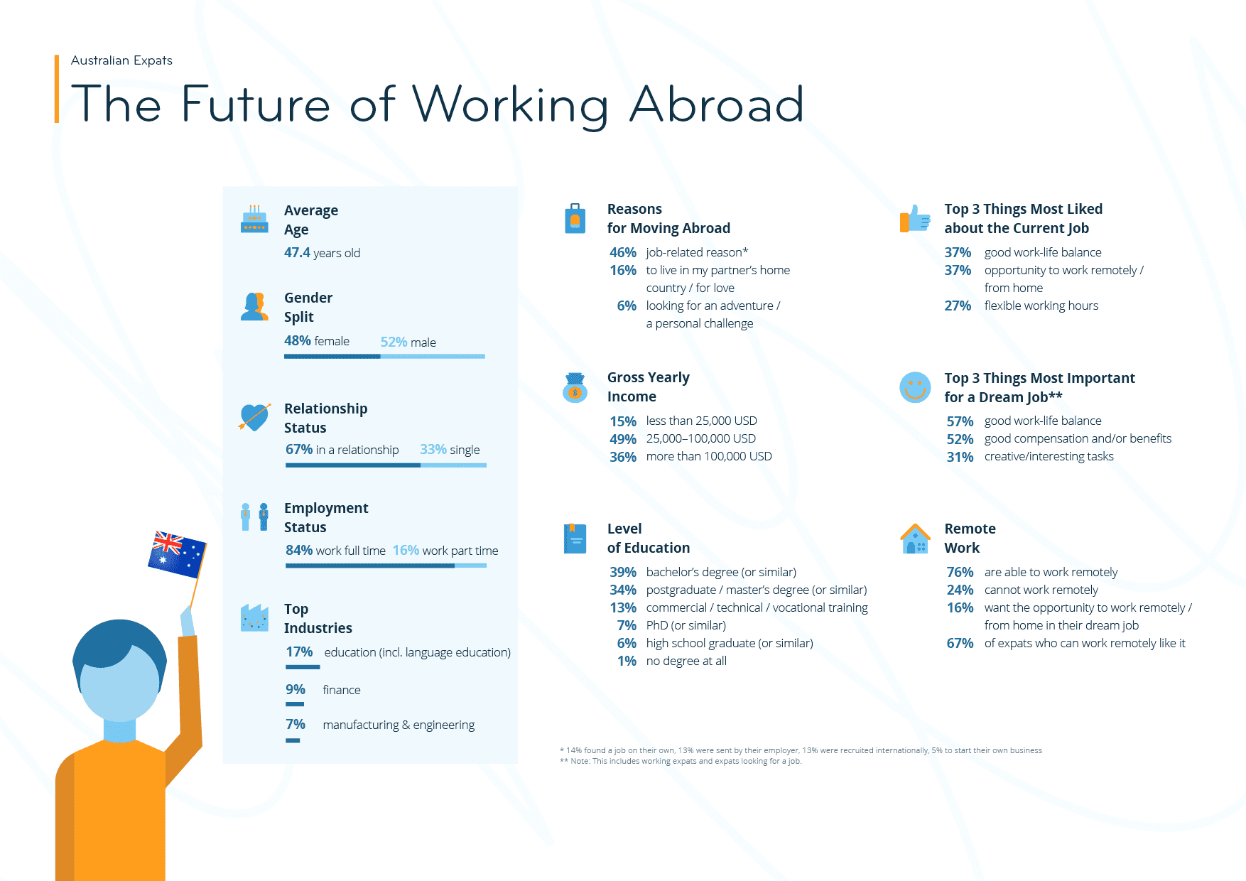In an ideal work environment, remote work is not that important for Australians working overseas, though: just 16% find this aspect especially important when imagining their dream job, compared to 22% of expats globally.