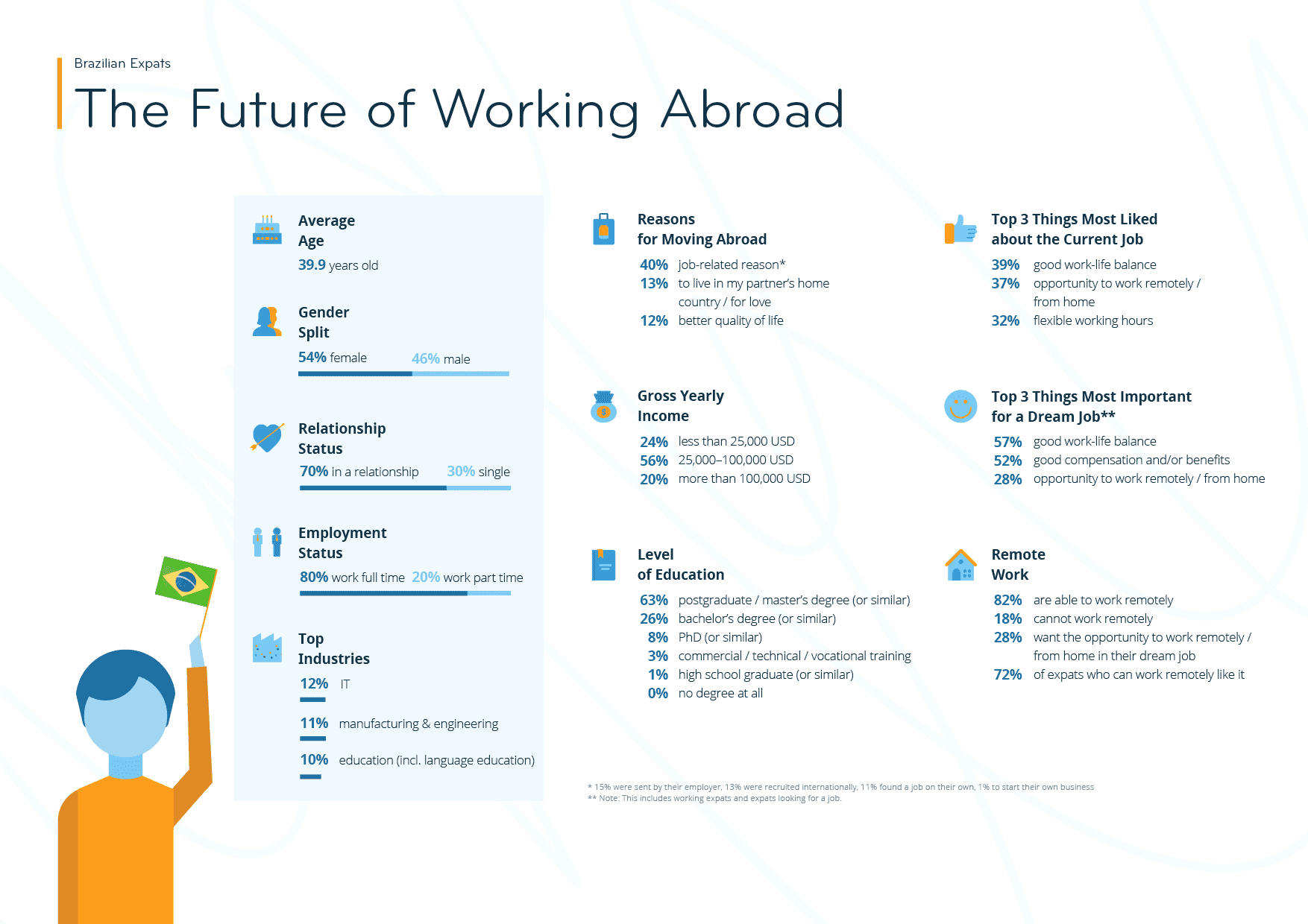 There are two more aspects that are more relevant for Brazilian expats than for the average expat working abroad when they are asked to imagine their dream job: 27% of Brazilians wish to have room for personal development/growth (vs. 22% globally), and 22% find the employer’s corporate culture/values important (vs. 15% globally).