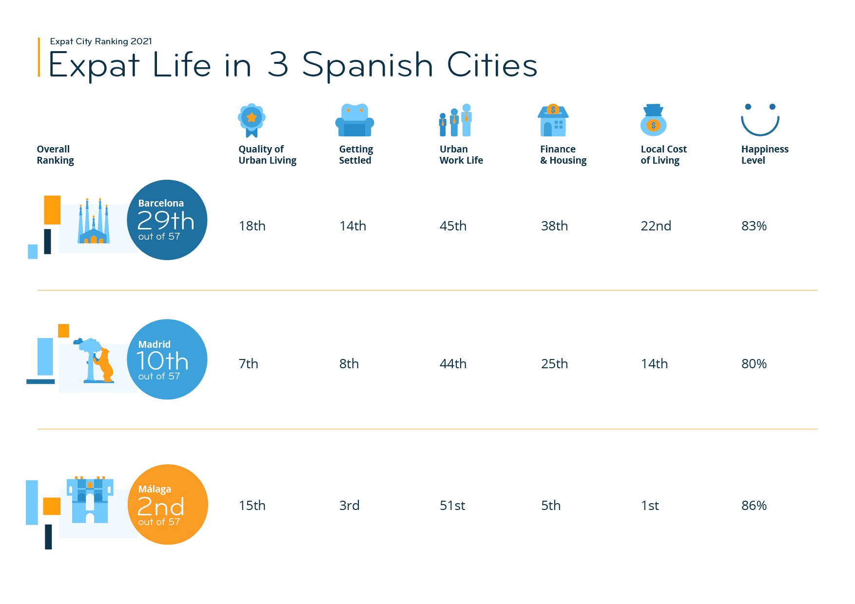 Málaga comes 2nd out of 57 in the Expat City Ranking 2021 — and even 1st in the Local Cost of Living Index: 86% of expats rate this factor positively (vs. 48% globally). It also does very well in the Finance & Housing Index (5th), far ahead of Madrid (25th) and Barcelona (38th). This is mainly due to the Housing Subcategory (3rd). Expats say that housing is both affordable (67% vs. 42% globally) and easy to find (70% vs. 60% globally).