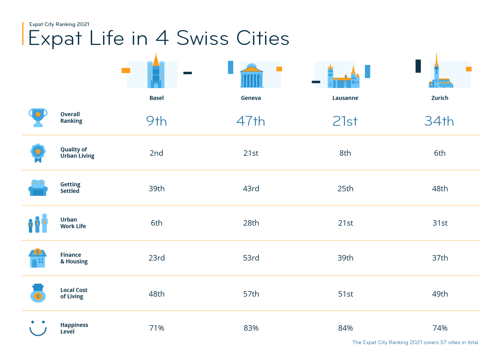 Narrowly avoiding the bottom 10, Geneva comes 47th out of 57 in the Expat City Ranking 2021. It has the worst results among the Swiss cities included in the report and is the only one that does not rank in the global top 10 of the Quality of Urban Living Index (21st). Similar to the other Swiss cities, Geneva ranks among the top 10 for political stability (1st) and in the bottom 10 for the affordability of healthcare (56th). However, it lags behind for all other factors in this index, with expats particularly unsatisfied with the local leisure options (23% vs. 14% globally).