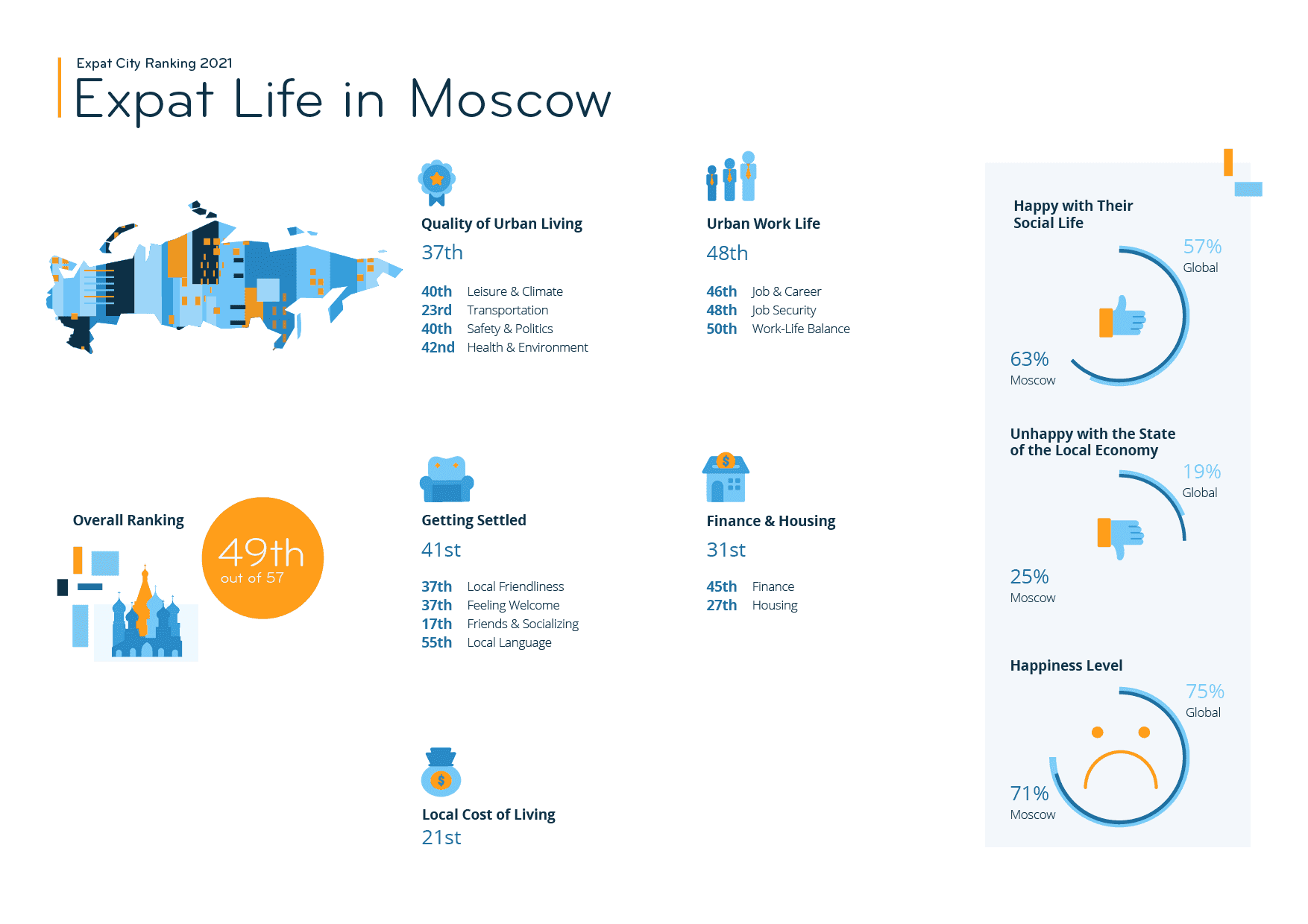 Moscow also lands in a low 41st place in the Getting Settled Index. Expats find it hard to learn the local language (60% vs. 42% globally), which is an issue since just 25% find it easy to live in Moscow without speaking it (vs. 54% globally). More than a quarter (27%) perceive the local residents as generally unfriendly (vs. 16% globally), and 23% do not feel at home in Moscow (vs. 19% globally). Still, 57% find it easy to make new friends (vs. 48% globally), and 63% are happy with their social life (57% globally).