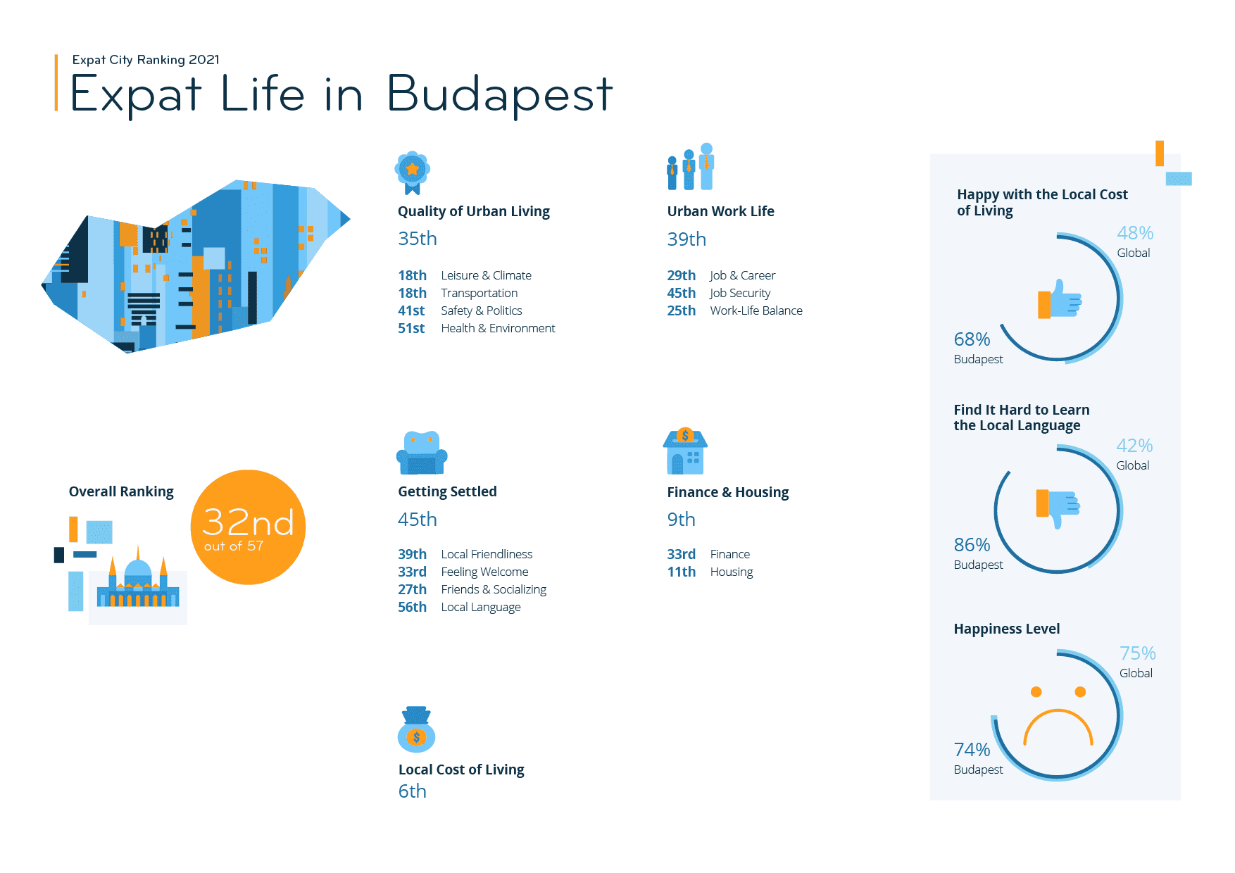 Budapest ranks 32nd out of 57 in the Expat City Ranking 2021 but lands in the top 10 of the Local Cost of Living (6th) and Finance & Housing (9th) Indices. Over two in three expats (68%) are satisfied with the cost of living in Budapest (vs. 48% globally), and 80% say that their disposable household income is enough or more than enough to cover their expenses (vs. 77% globally). Housing is not just affordable (57% vs. 42% globally) but also easy to find (70% vs. 60% globally).