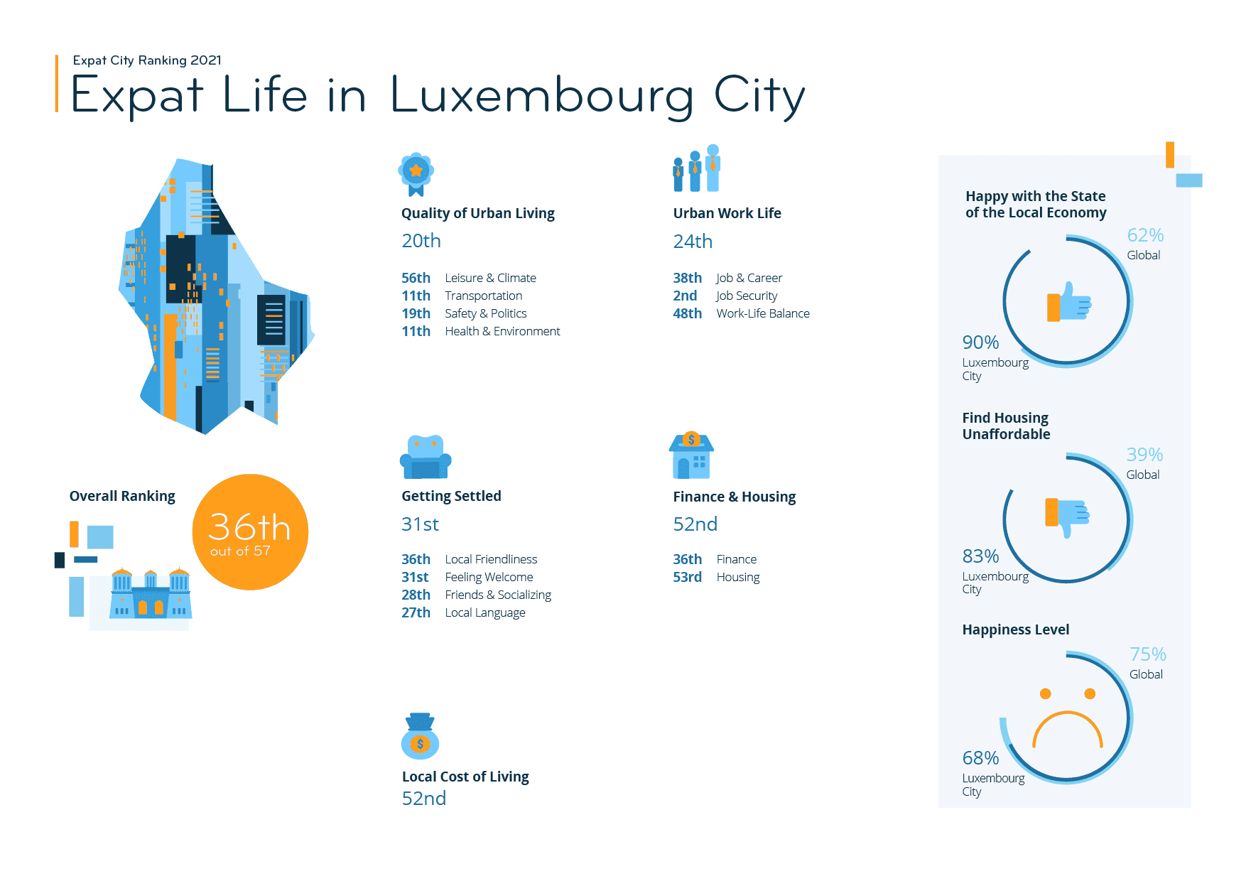 Luxembourg City comes below the global average in the Expat City Ranking 2021 (36th out of 57), with particularly poor results for costs and finances. More than three in five expats (62%) find the local cost of living too high (vs. 34% globally), ranking the city 52nd in the Local Cost of Living Index. The city ranks the same in the Finance & Housing Index (52nd), even coming 53rd in the Housing Subcategory. Expats describe housing as unaffordable (83% vs. 39% globally) and hard to find (47% vs. 23% globally). A French expat says that “the housing costs for both renting and buying are a nightmare”.