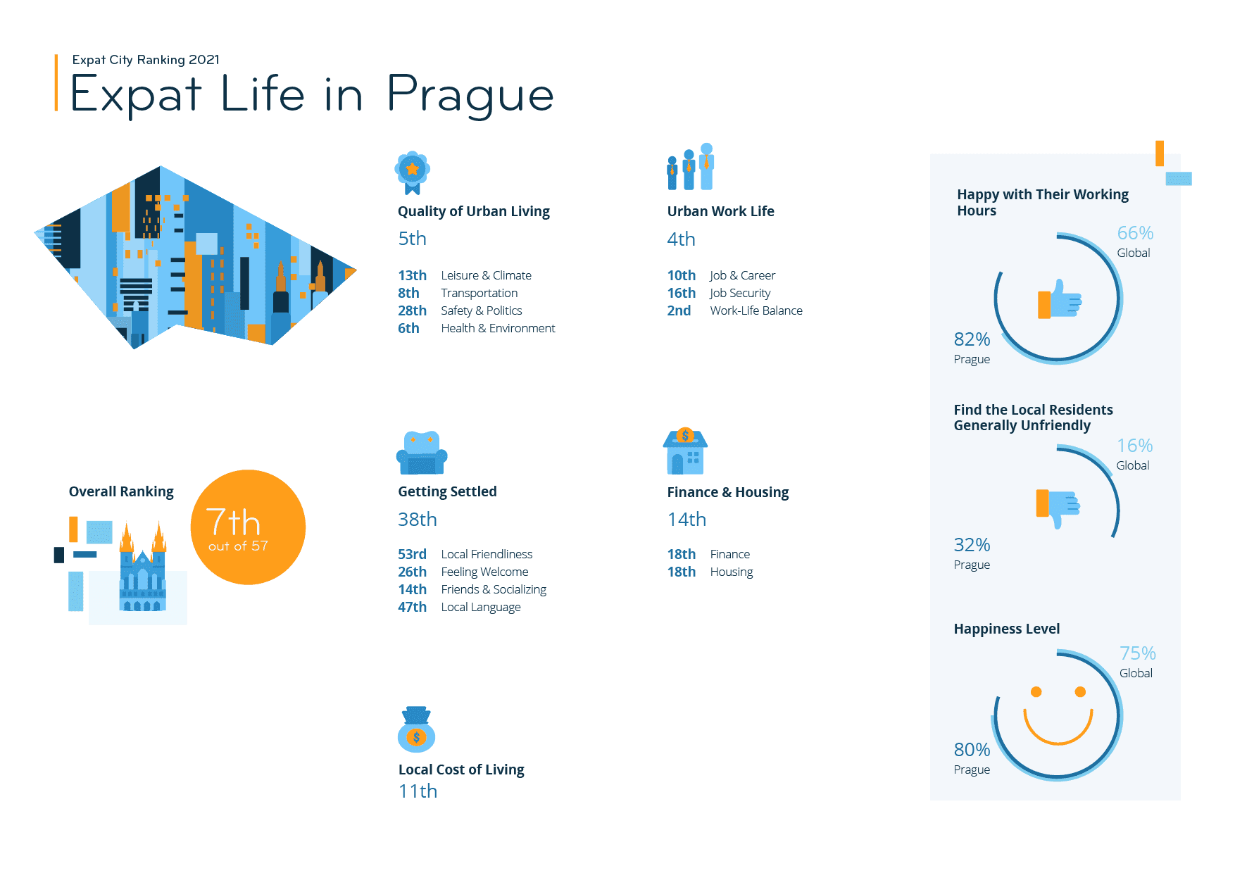Prague not only makes it into the global top 10 of the Expat City Ranking (7th) but also into the top 5 for two indices. It ranks 4th in the Urban Work Life Index, after Munich (1st), Aachen (2nd), and Dublin (3rd). Expats are particularly happy with the local career opportunities (60% vs. 45% globally), work-life balance (79% vs. 66% globally), and working hours (82% vs. 66% globally). The city also comes 5th in the Quality of Urban Living Index. “I enjoy the great opportunities for socializing, activities, and traveling, and personal growth,” states a female expat from Ukraine. In fact, 83% of expats rate the local leisure options favorably (vs. 72% globally), and 91% are happy with the transportation system (vs. 69% globally). Healthcare is not only easily available (87% vs. 76% globally) but also easy to afford (85% vs. 61% globally).