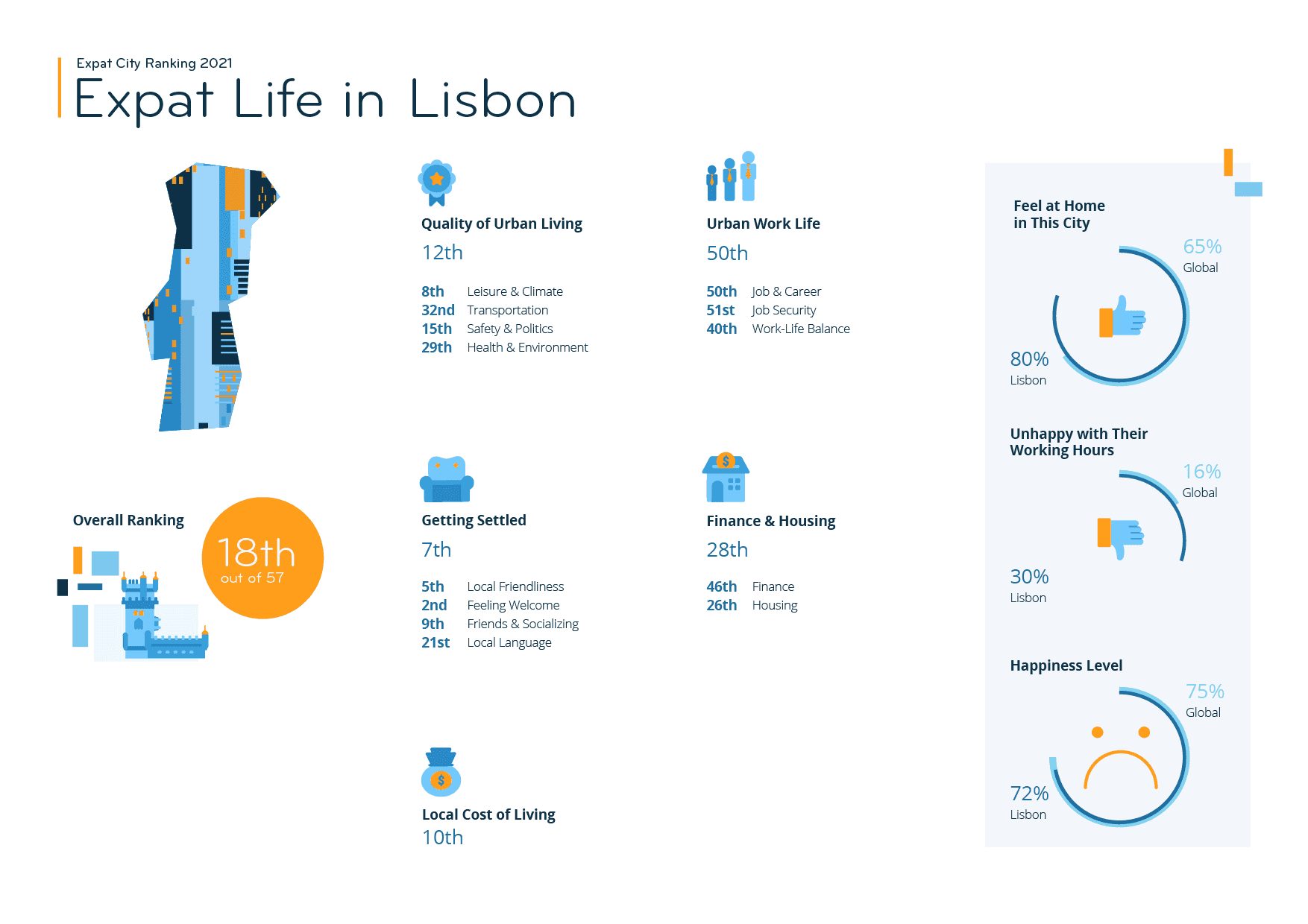 Out of 57 cities in the Expat City Ranking 2021, Lisbon comes in 18th place. It performs best in the Getting Settled Index (7th) and ranks 1st worldwide for expats feeling at home (80% vs. 65% globally). Expats find it easy to get used to the local culture (84% vs. 65% globally) and describe the local people as generally friendly (80% vs. 69% globally). “Many people here are warm, good-natured, respectful, friendly, and welcoming,” says a US American expat. Indeed, expats find it easy to make friends (62% vs. 48% globally) and are happy with their social life (68% vs. 57% globally).